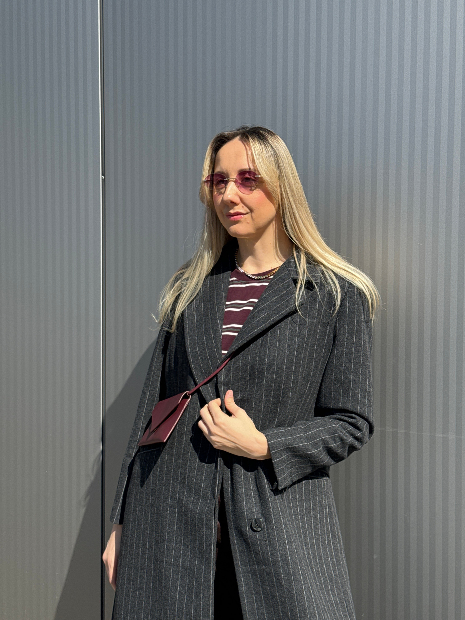 A young adult woman with long, straight blonde hair and fair skin is captured in a mid-shot, posing outdoors in Riga, Latvia. She is looking towards the camera with a subtle smile, wearing small, roun…read more