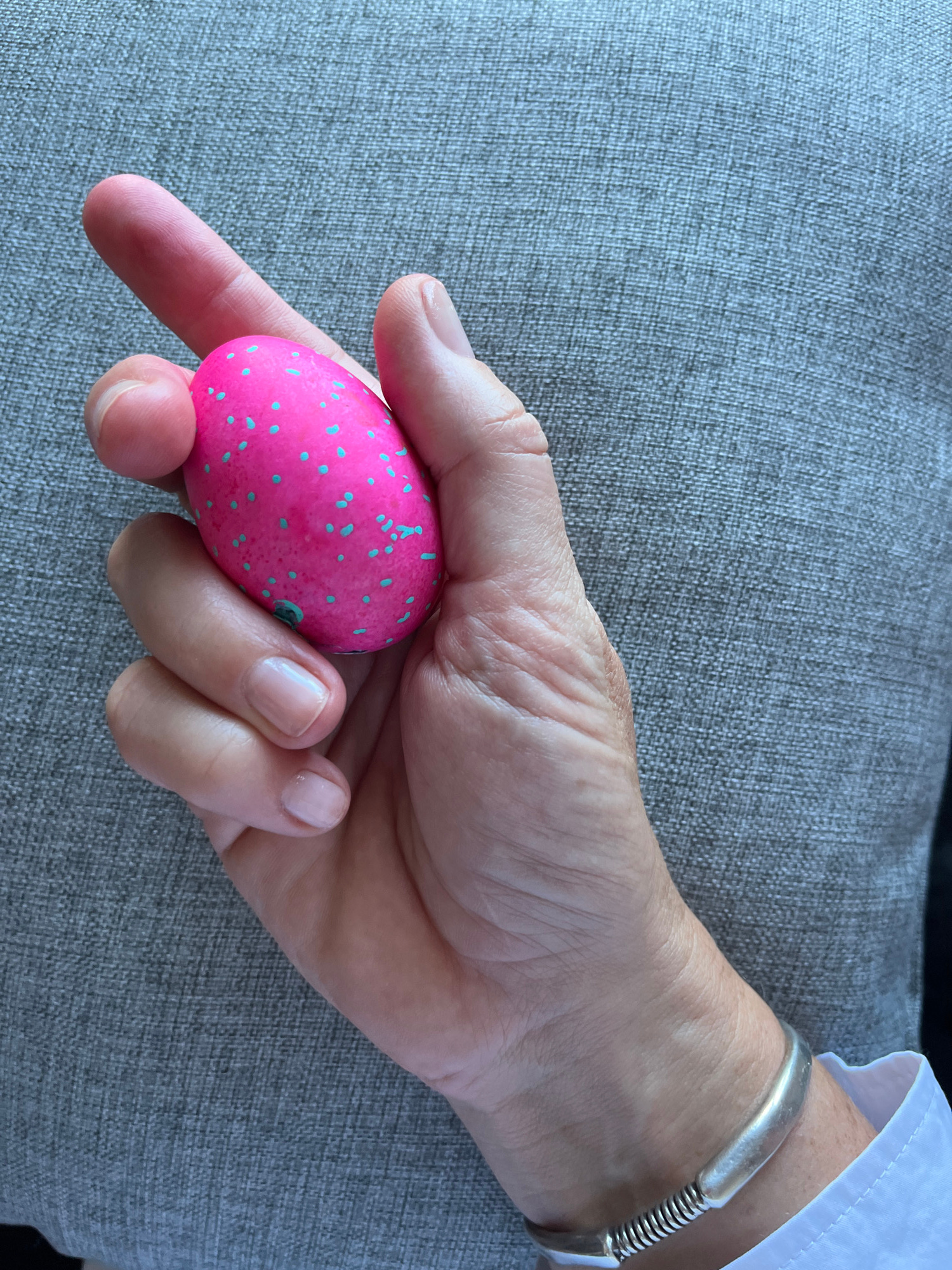 A hand is holding a pink Easter egg with light blue spots. The hand is wearing a silver bracelet. The background is a gray fabric. There is no indication of the location being Denpasar, Indonesia.