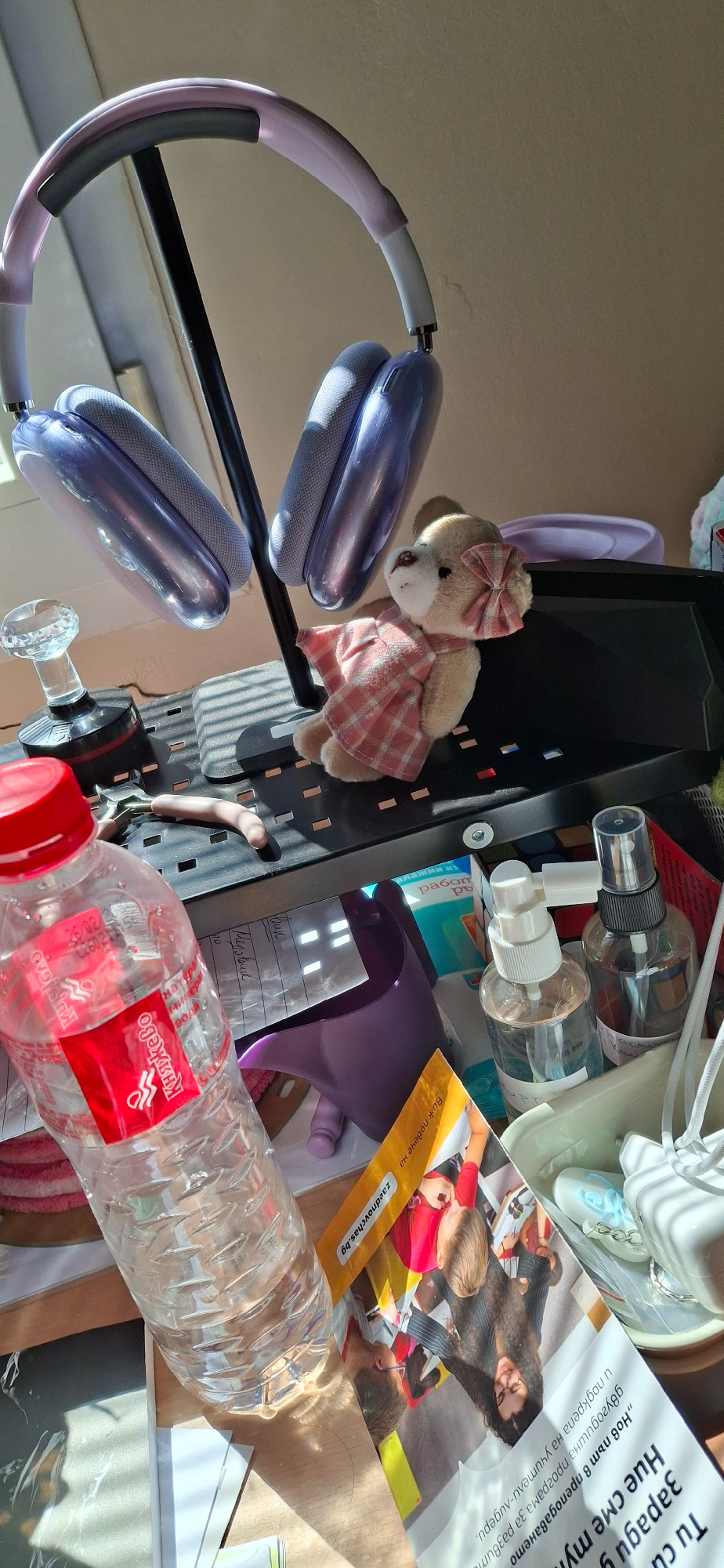 The image depicts a cluttered scene, likely an indoor setting. There is a pair of pink and silver over-ear headphones positioned near a black metallic shelf. A small, tan teddy bear with a pink bow an…read more