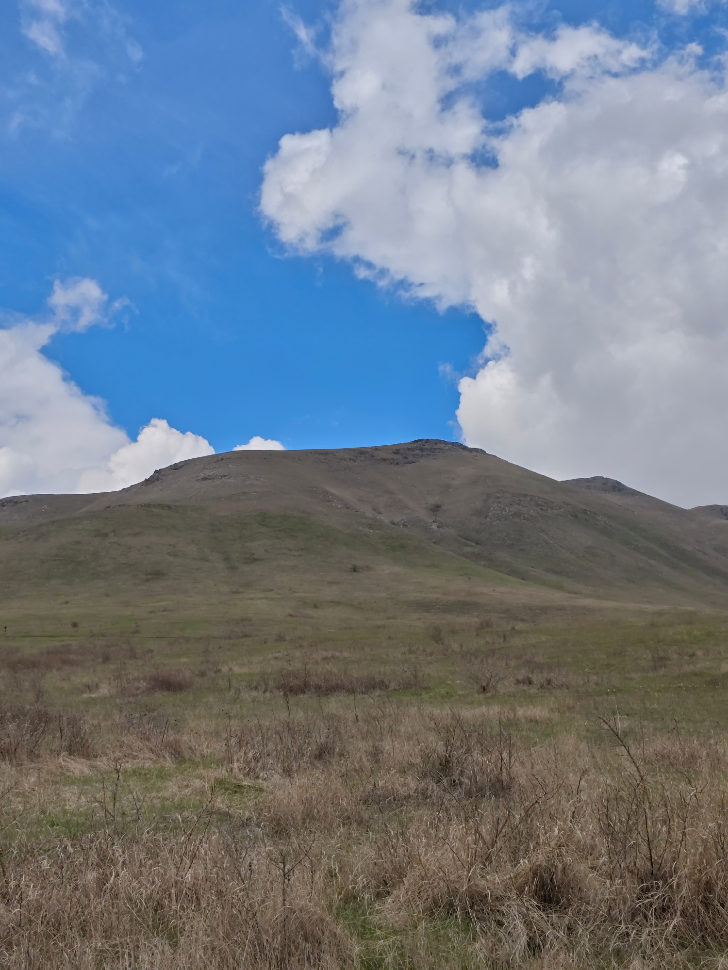 The image depicts a rural landscape in Etoka, Russia. A gently sloping, grassy hill dominates the scene, with a rocky peak visible at the top. The foreground is filled with dry, brown grasses and low…read more
