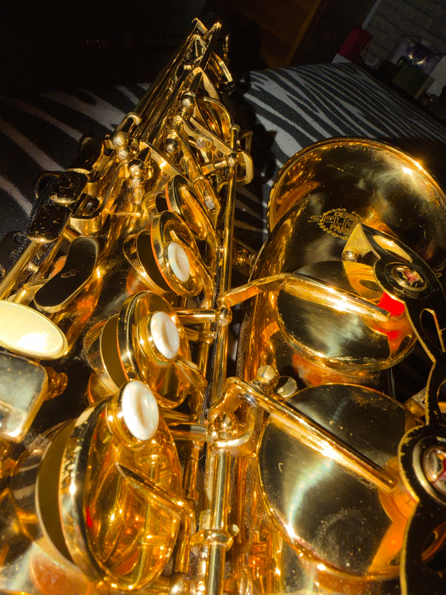 A close-up, high-angle photograph showcases the golden brass body of a saxophone, resting on a black and white striped surface, which appears to be a fabric cover. The instrument's intricate key mecha…read more