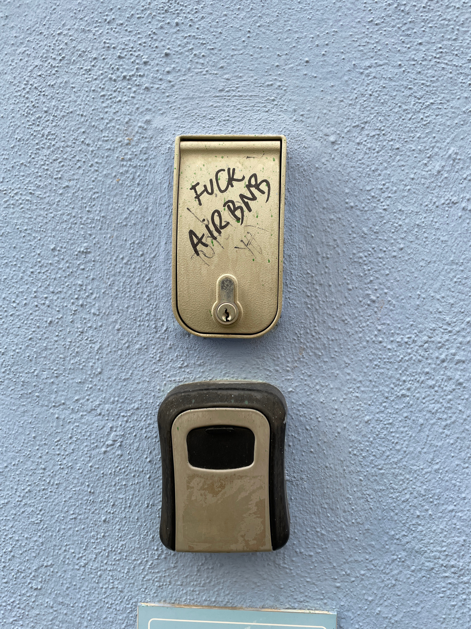 A close-up, eye-level shot shows two lockboxes mounted on a light blue textured wall. To the left, a beige, rectangular lockbox has "FUCK Airbnb" written on it in black marker. It also has a small key…read more