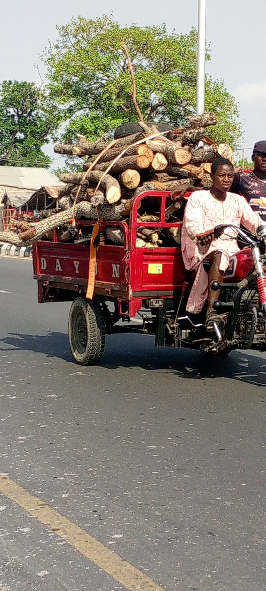 In Adankolo, Nigeria, a man operates a red DAYUN three-wheeled motorcycle heavily loaded with tree logs. The logs fill the rear bed, extending well above its sides. The man is wearing a light pink shi…read more