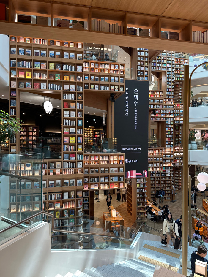 The image depicts the interior of the Byeolmadang Library at Starfield Suwon, located in Suwon-si, Gyeonggi-do, South Korea. The scene is captured from an elevated viewpoint looking down into a multi-…read more