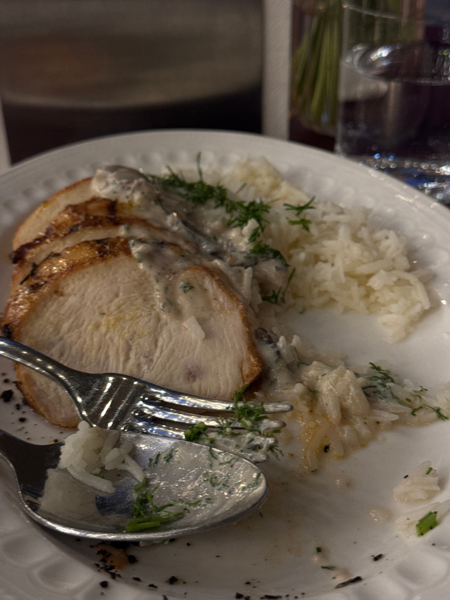 The image shows a partially eaten meal on a white plate. The main component appears to be sliced meat, likely turkey or chicken, covered in a cream sauce with mushrooms and dill. Next to the meat is a…read more