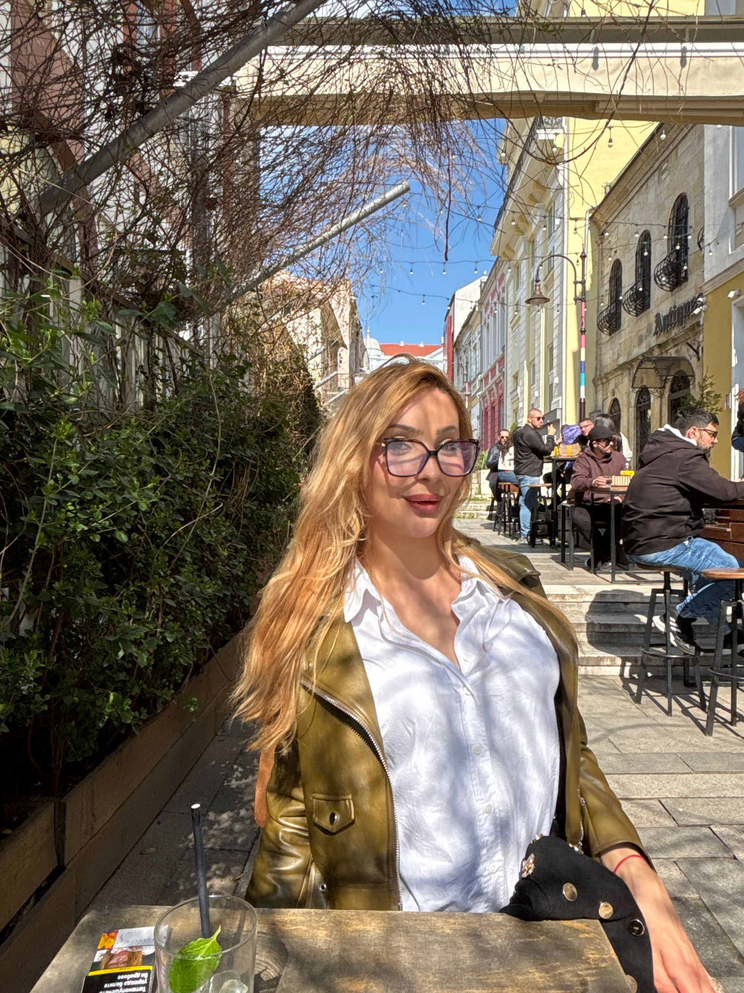 The image depicts a woman with long blonde hair and glasses seated at an outdoor table in what appears to be a pedestrian area, likely in Varna, Bulgaria, given the architecture. She is wearing a whit…read more