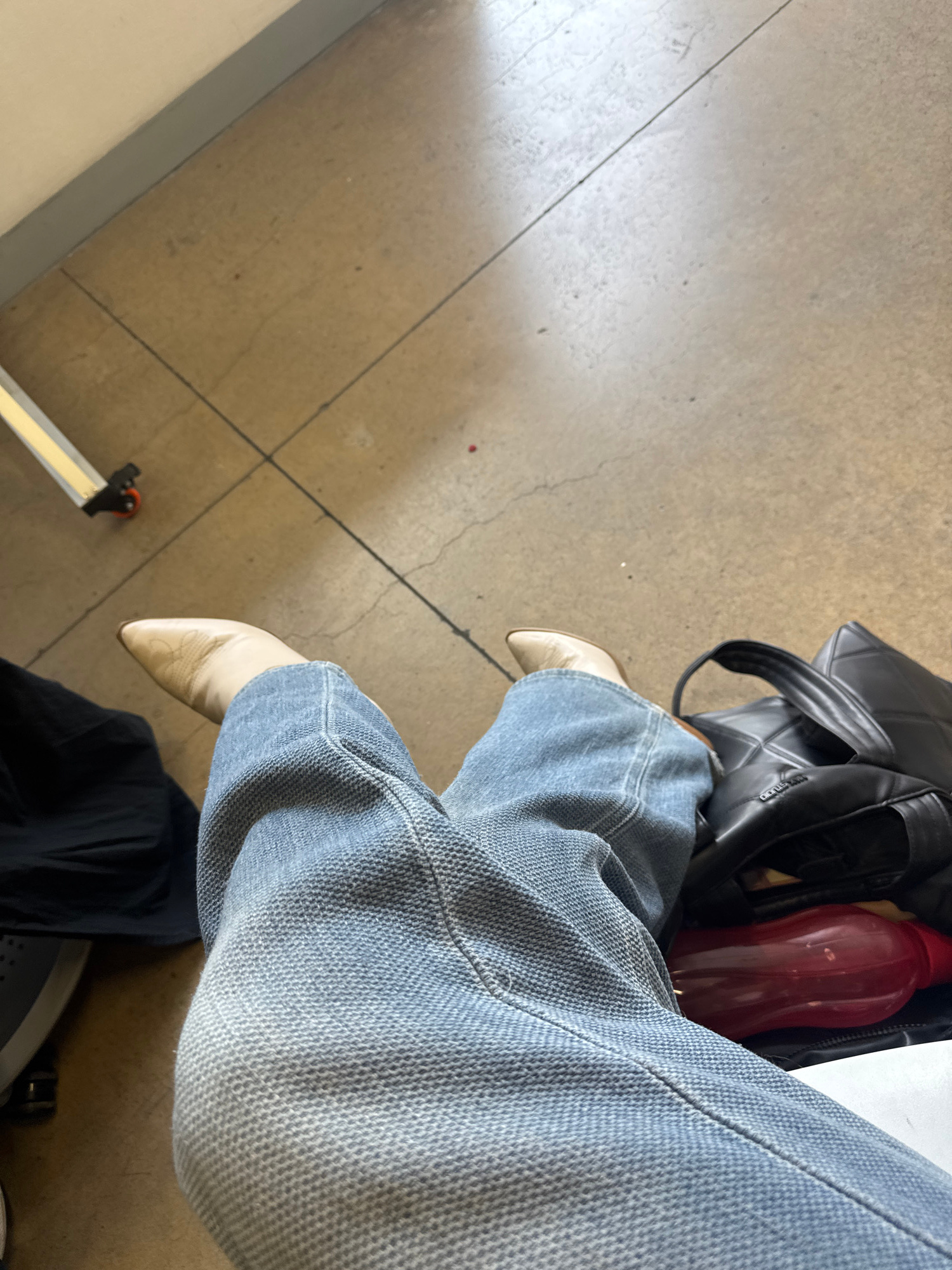The image depicts a person seated, wearing light-wash denim jeans and beige pointed boots. Beside the person is a black bag with a red water bottle partially visible inside. The floor is a neutral ton…read more