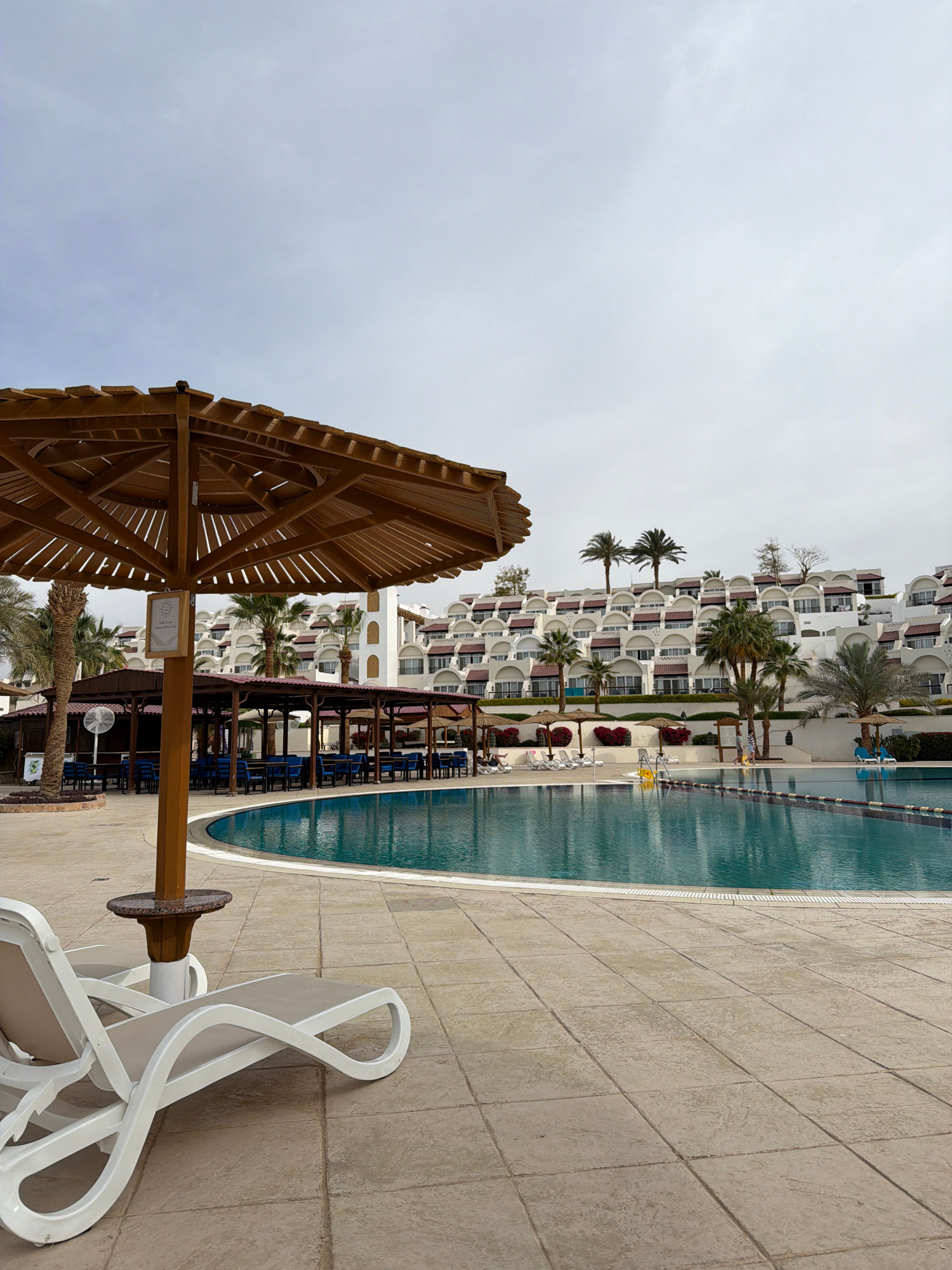 The image shows a poolside view in Sharm El Sheikh, Egypt. A wooden shade structure dominates the left foreground. A white chaise lounge sits on a tiled patio. A swimming pool with clear blue water ru…read more