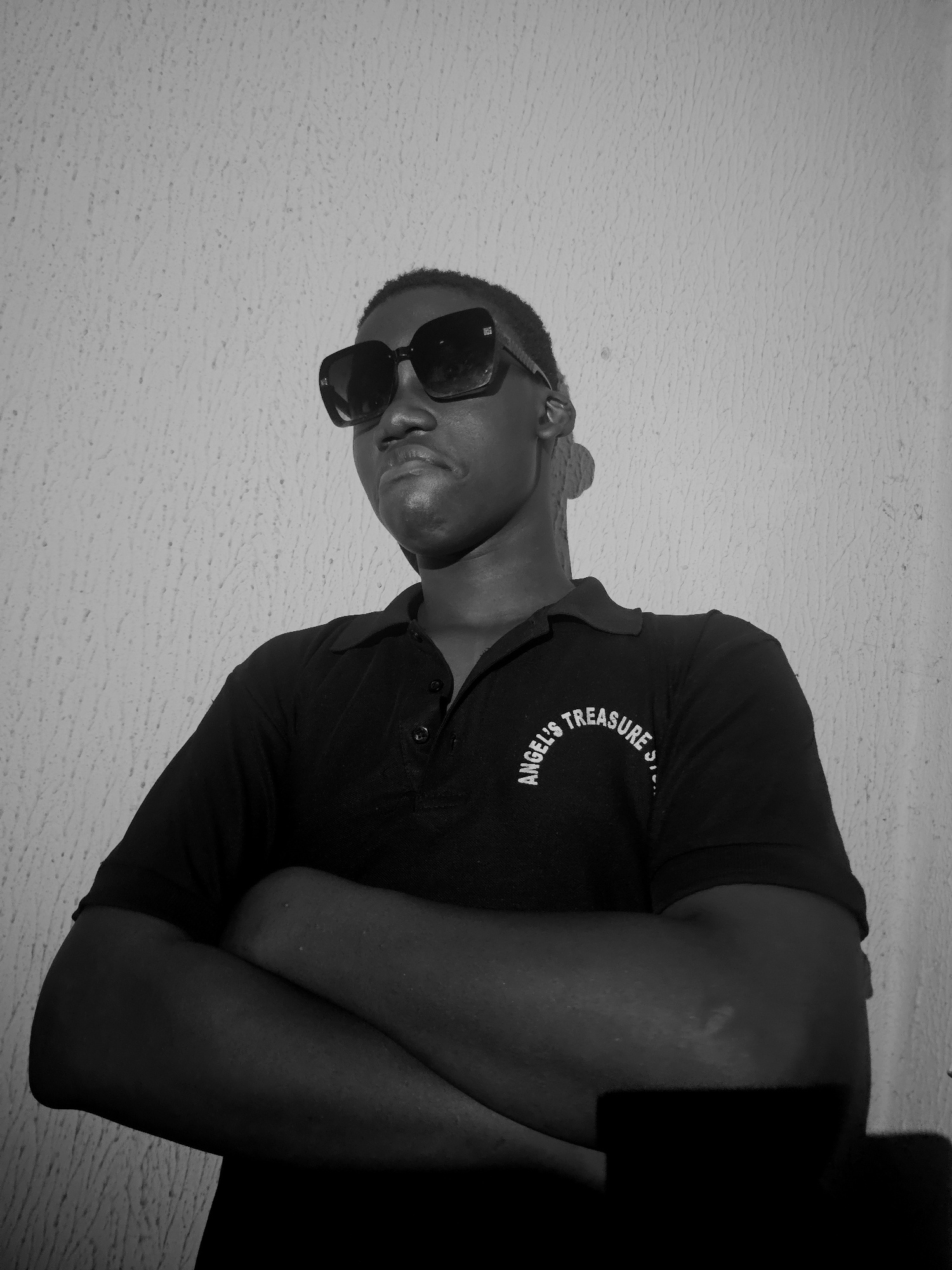 A monochrome image shows a man wearing sunglasses and a dark polo shirt with the words "ANGEL'S TREASURE S…" printed on it. He is standing with his arms crossed. The background appears to be a texture…read more