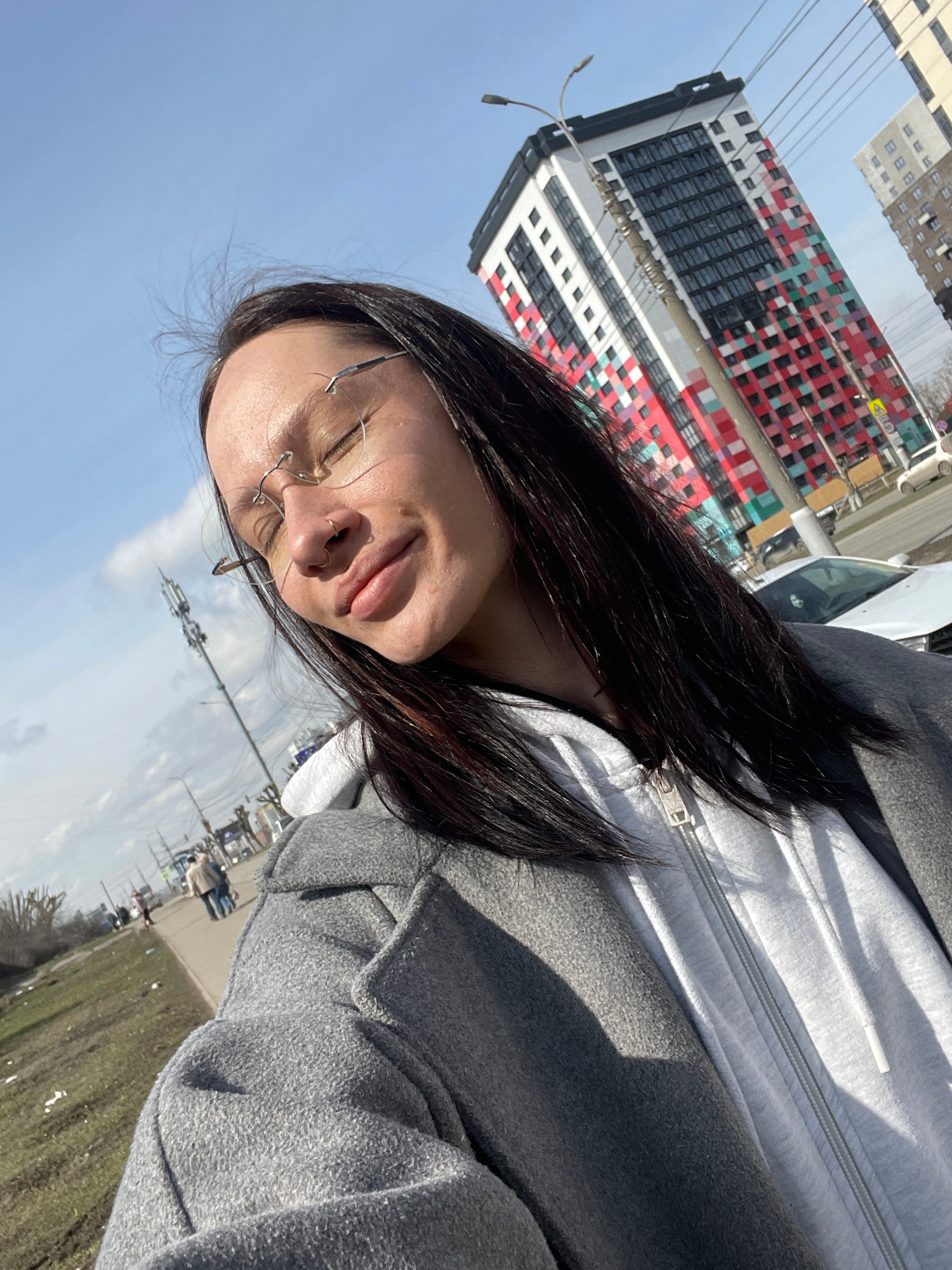 A woman wearing glasses, a white zippered hooded sweatshirt, and a gray coat takes a selfie in front of a tall building with a red, white, green, and black geometric pattern in Izhevsk, Russia. The sk…read more