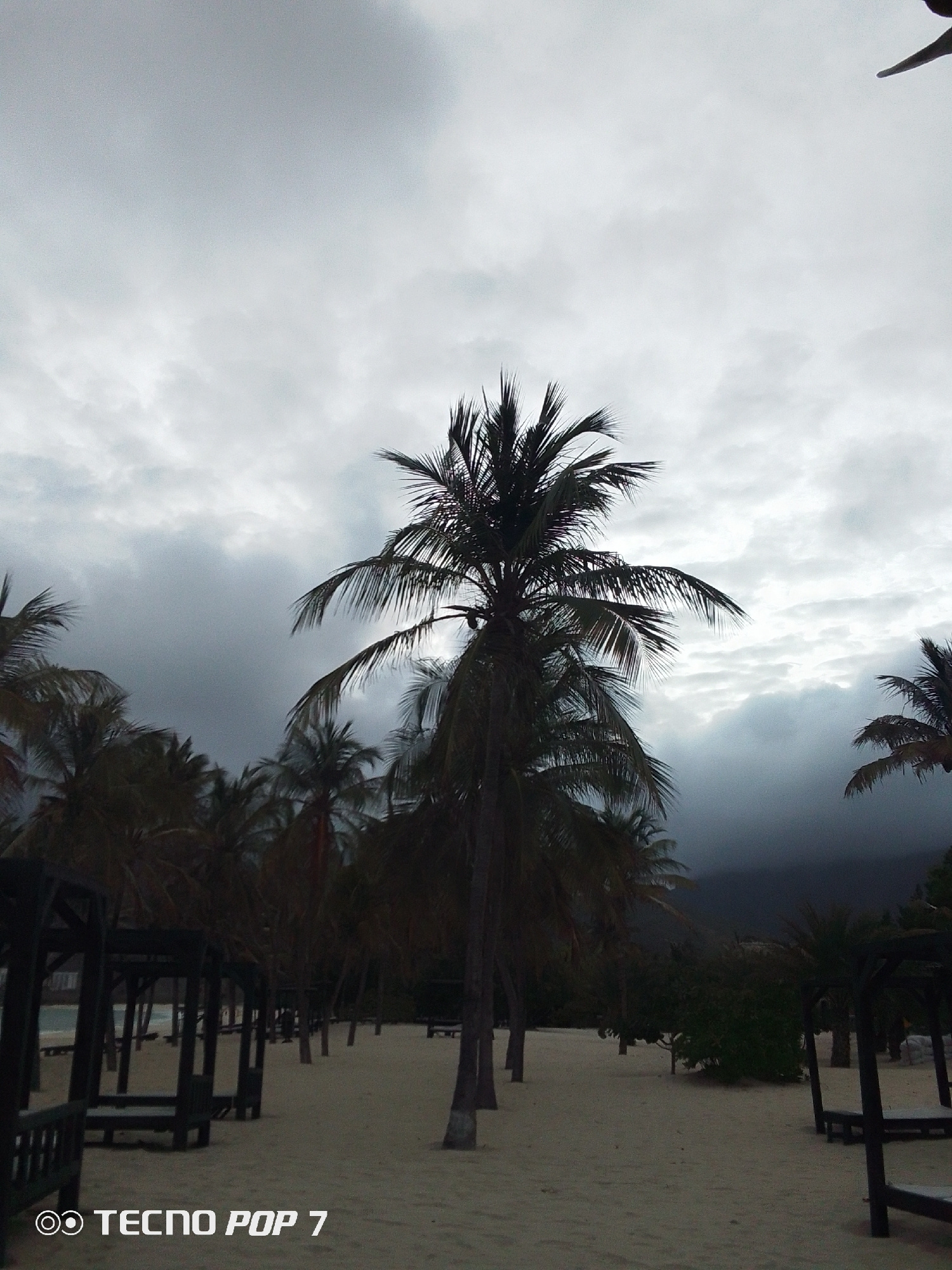 The image displays an overcast coastal scene in Pedro González, Venezuela. A dense, gray cloud cover dominates the sky, with darker cloud formations present over distant mountainous terrain on the rig…read more