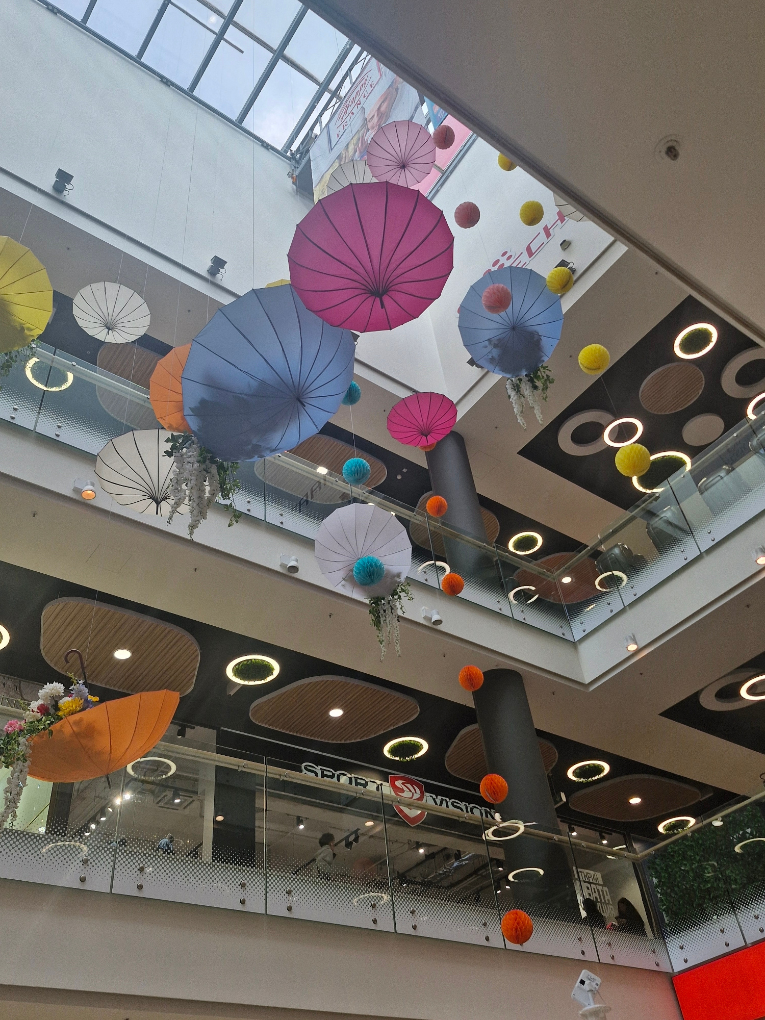 The image presents an upward perspective within the multi-story interior of a modern shopping mall, likely located in Sofia, Bulgaria. The primary focus is a vibrant decorative display of numerous col…read more