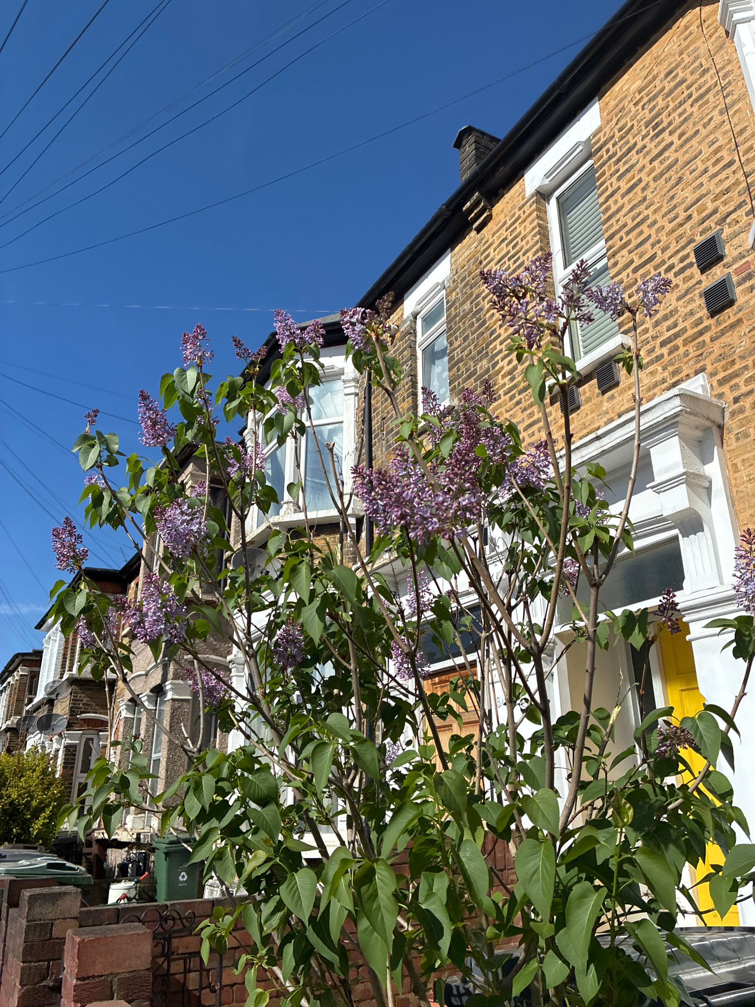 Here is a concise description of the image: The image shows a residential street scene in London, UK on a sunny day. A blooming lilac bush is prominent in the foreground, partially obscuring a row of…read more