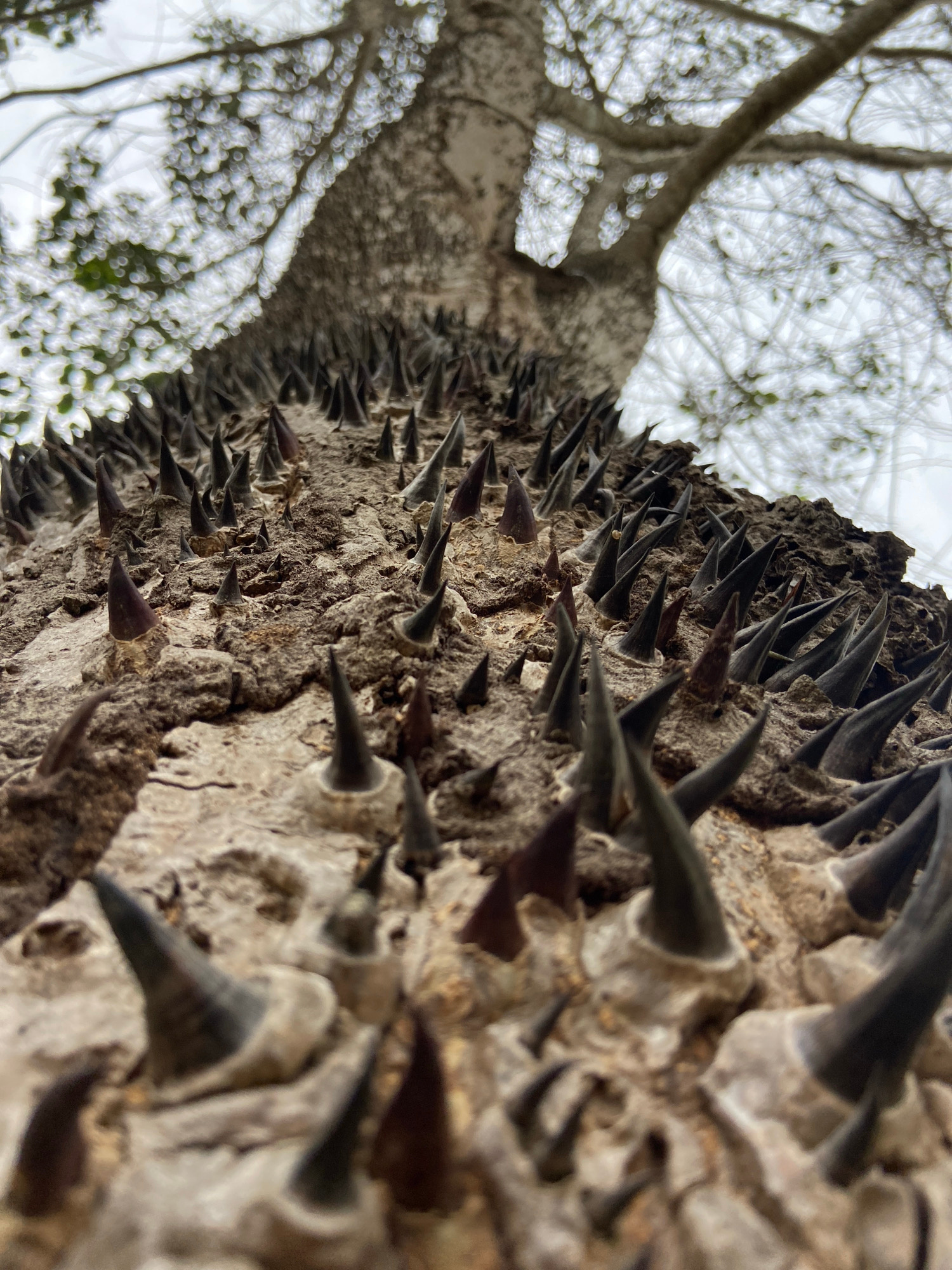 The image shows a close-up of a tree trunk with conical thorns covering its surface. The bark is rough and textured, with varying shades of gray and brown. The thorns are dark in color and densely pac…read more