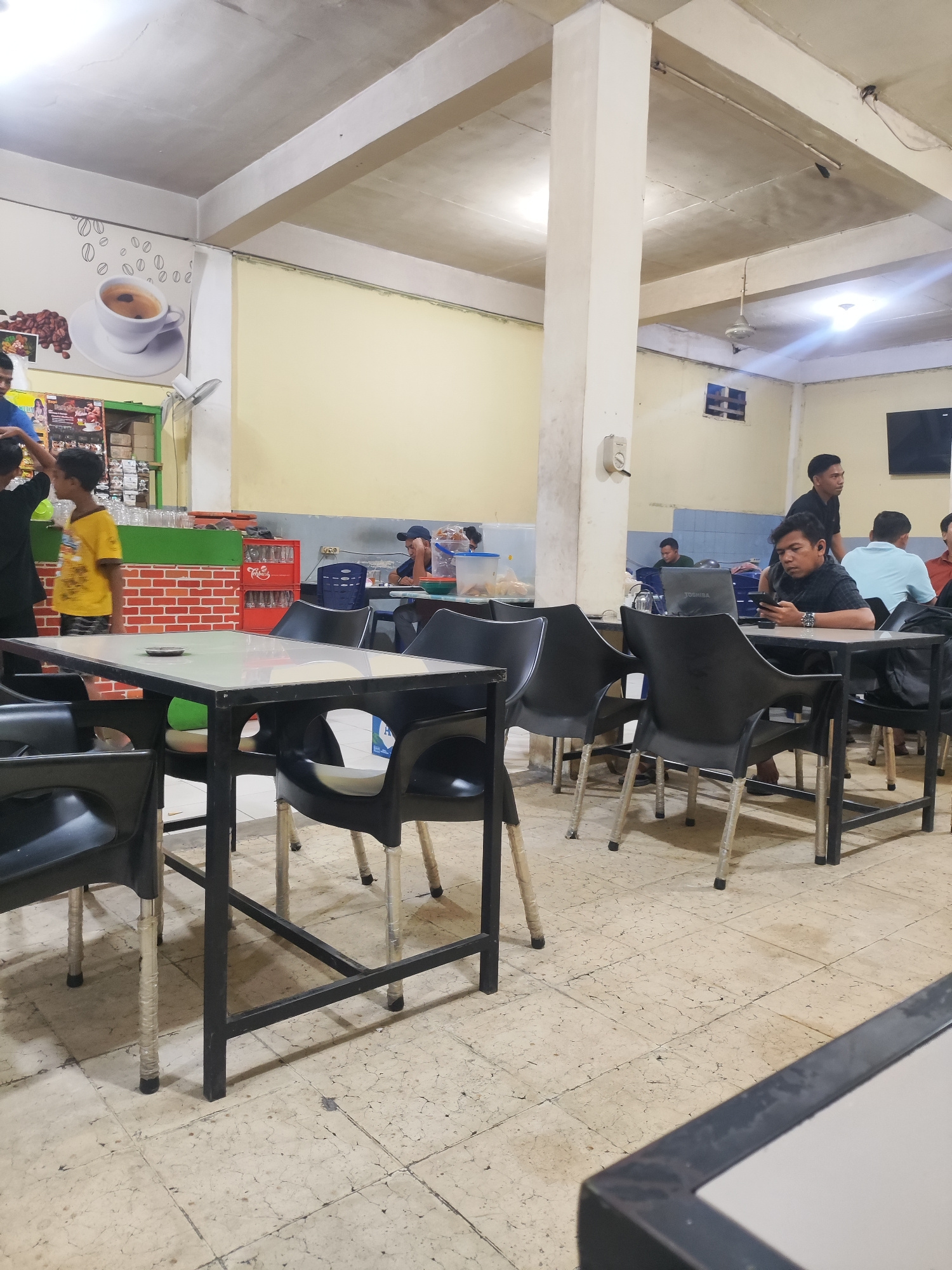 The image captures the interior of a casual eatery or cafe in Lhokseumawe, Indonesia, likely during the evening or night, indicated by the artificial lighting. The space features light yellow walls an…read more