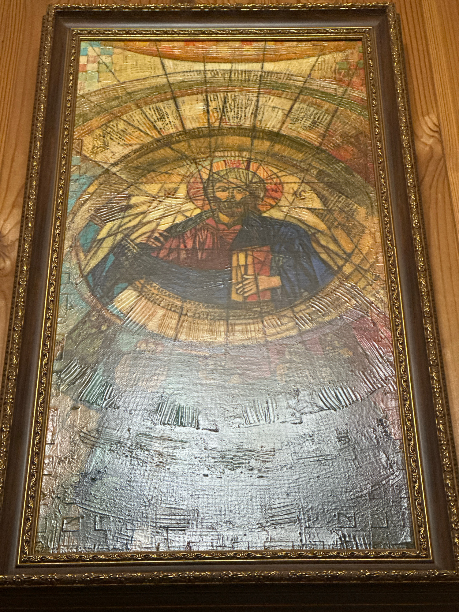 A framed rectangular artwork is displayed on a wooden surface. The frame is ornate, with a dark brown inner band and a gold-colored patterned outer band. The artwork within depicts an abstract or styl…read more