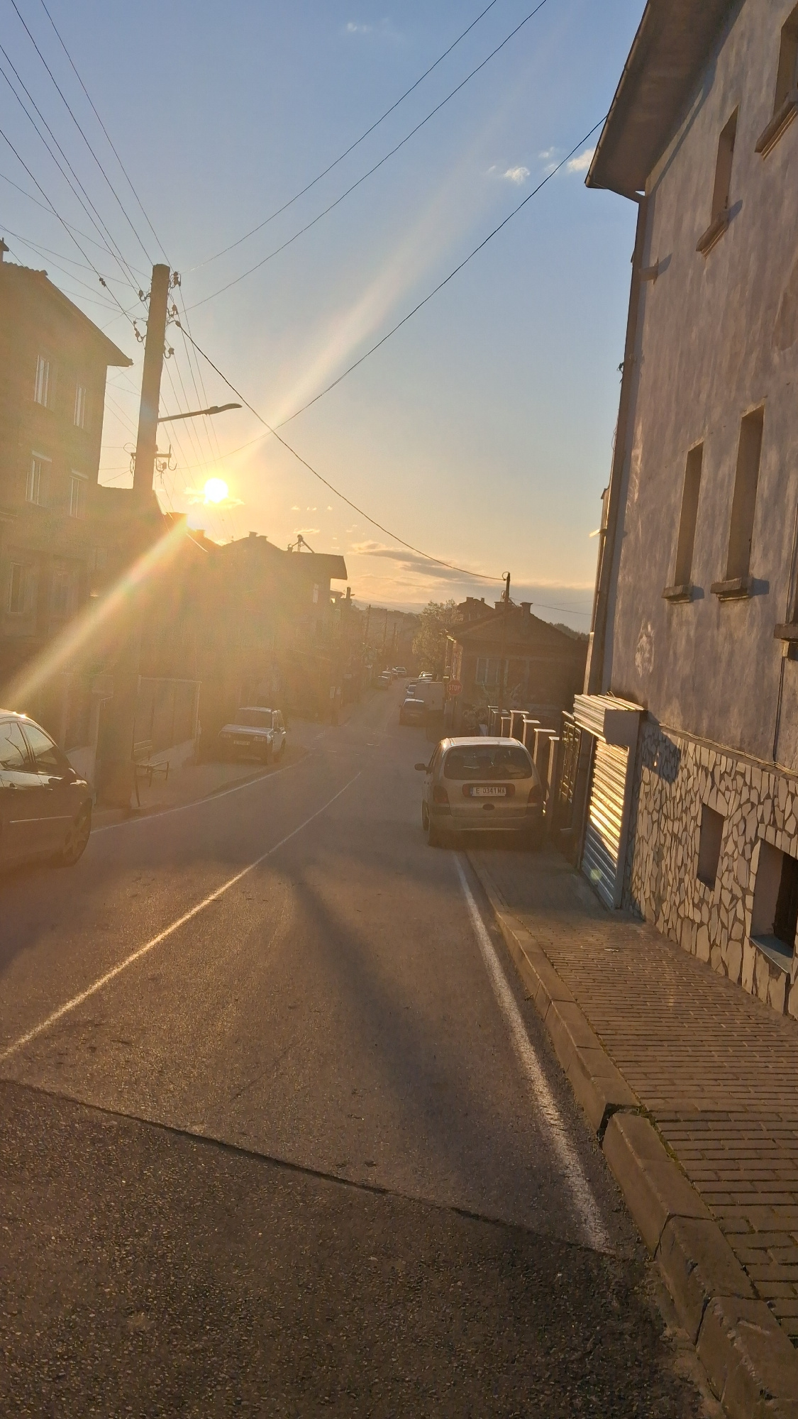 The image shows a street in Goce Delchev, Bulgaria, at sunset. The view is looking down the street, with buildings on either side. Cars are parked and driving on the street. Power lines are visible ag…read more