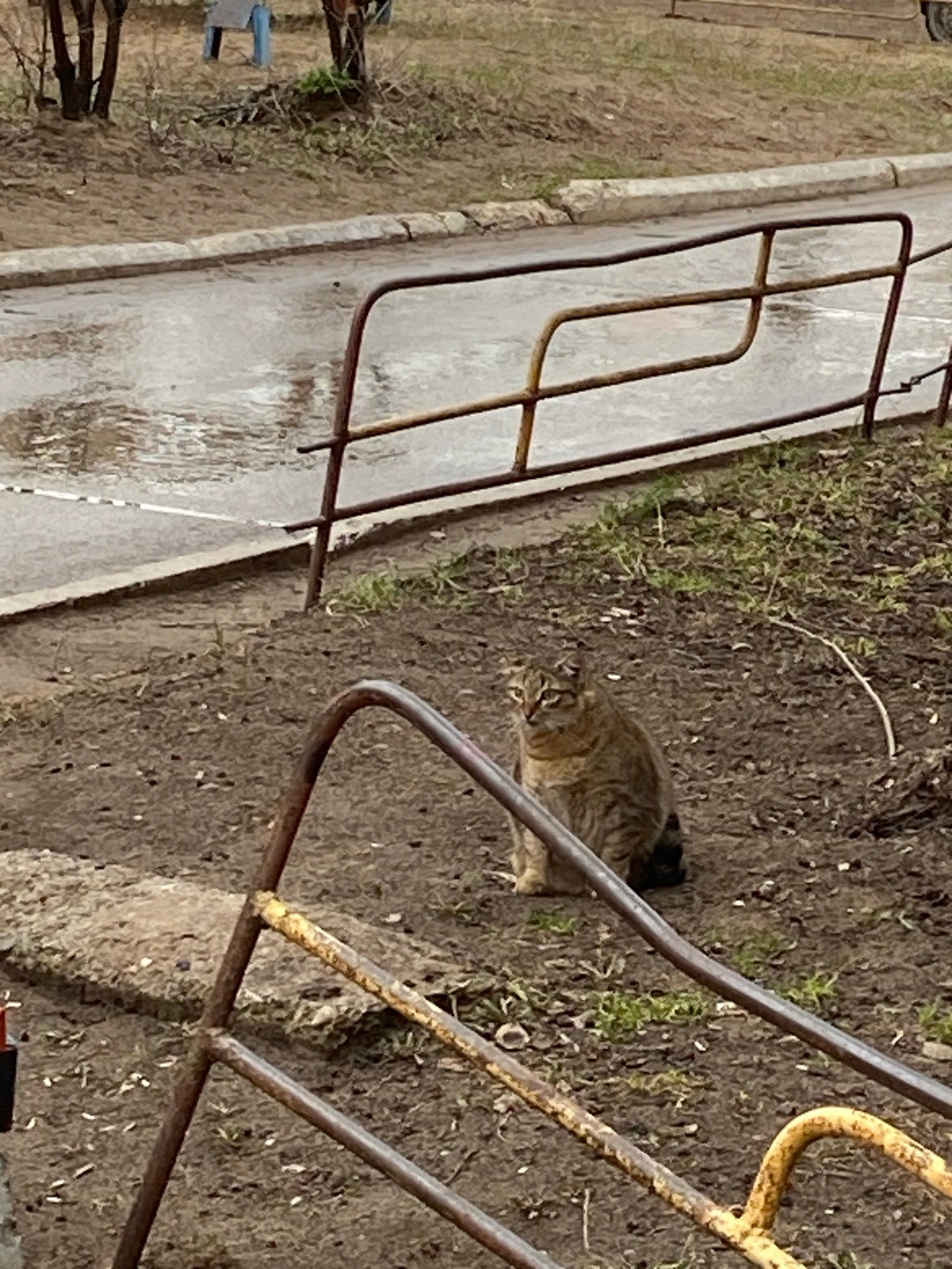 A medium shot, rotated, depicts a tabby cat crouching on a patch of dirt and sparse vegetation near what appears to be a walkway in Noviy, Russia. A rusted metal fence partially obscures the view. Theβ¦read more
