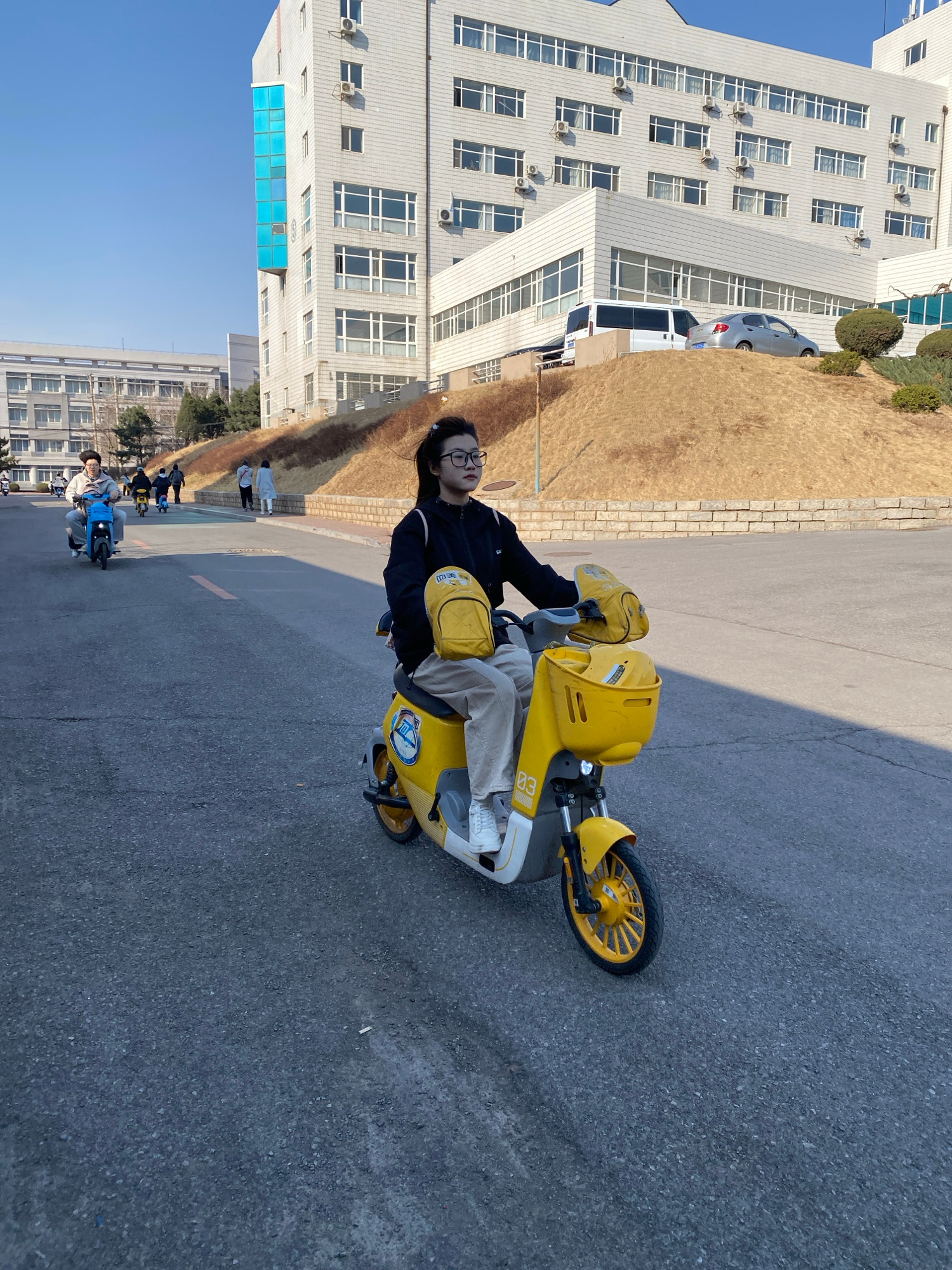 A person with glasses sits on a yellow scooter on an asphalt road. Buildings with multiple windows and visible air conditioning units are in the background. In the distant background, other people are…read more