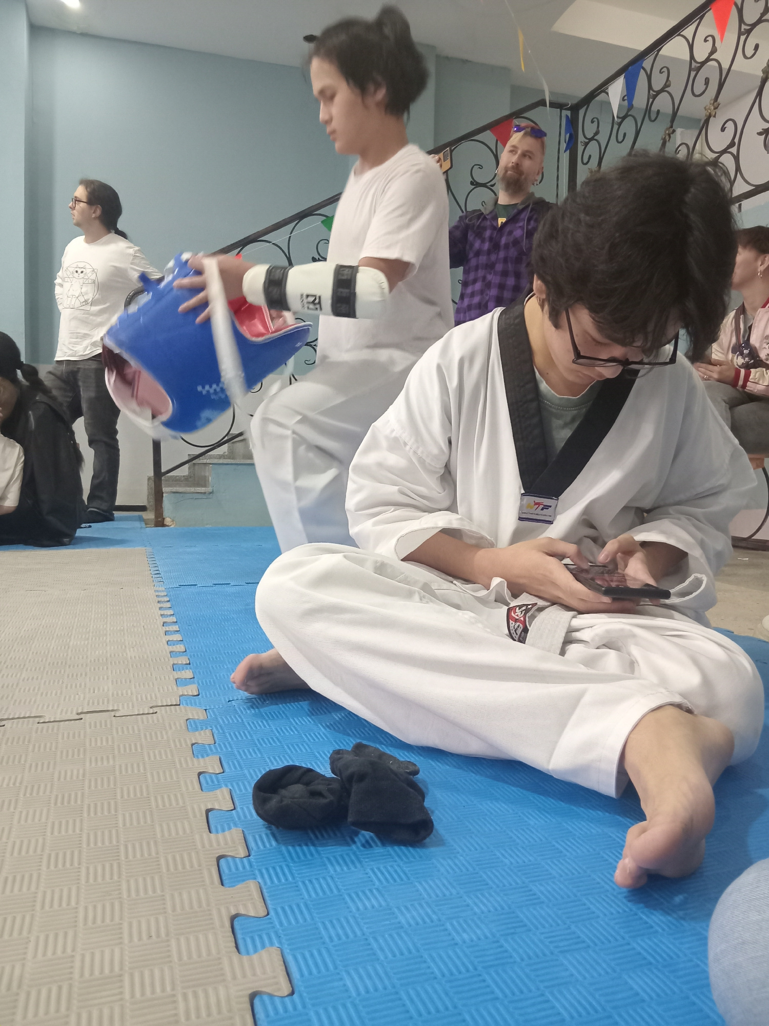 The image shows an indoor scene. A person wearing a white taekwondo uniform with a black belt sits cross-legged on a blue and grey interlocking foam mat and looks at a phone. Black socks sit beside th…read more
