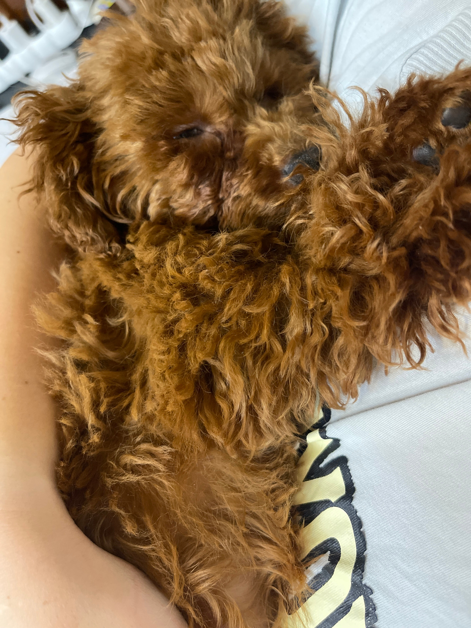 A close-up, slightly angled shot shows a small, brown, curly-haired dog resting on a person's chest. The dog appears to be a poodle or a similar breed. The person is wearing a light-colored shirt with…read more