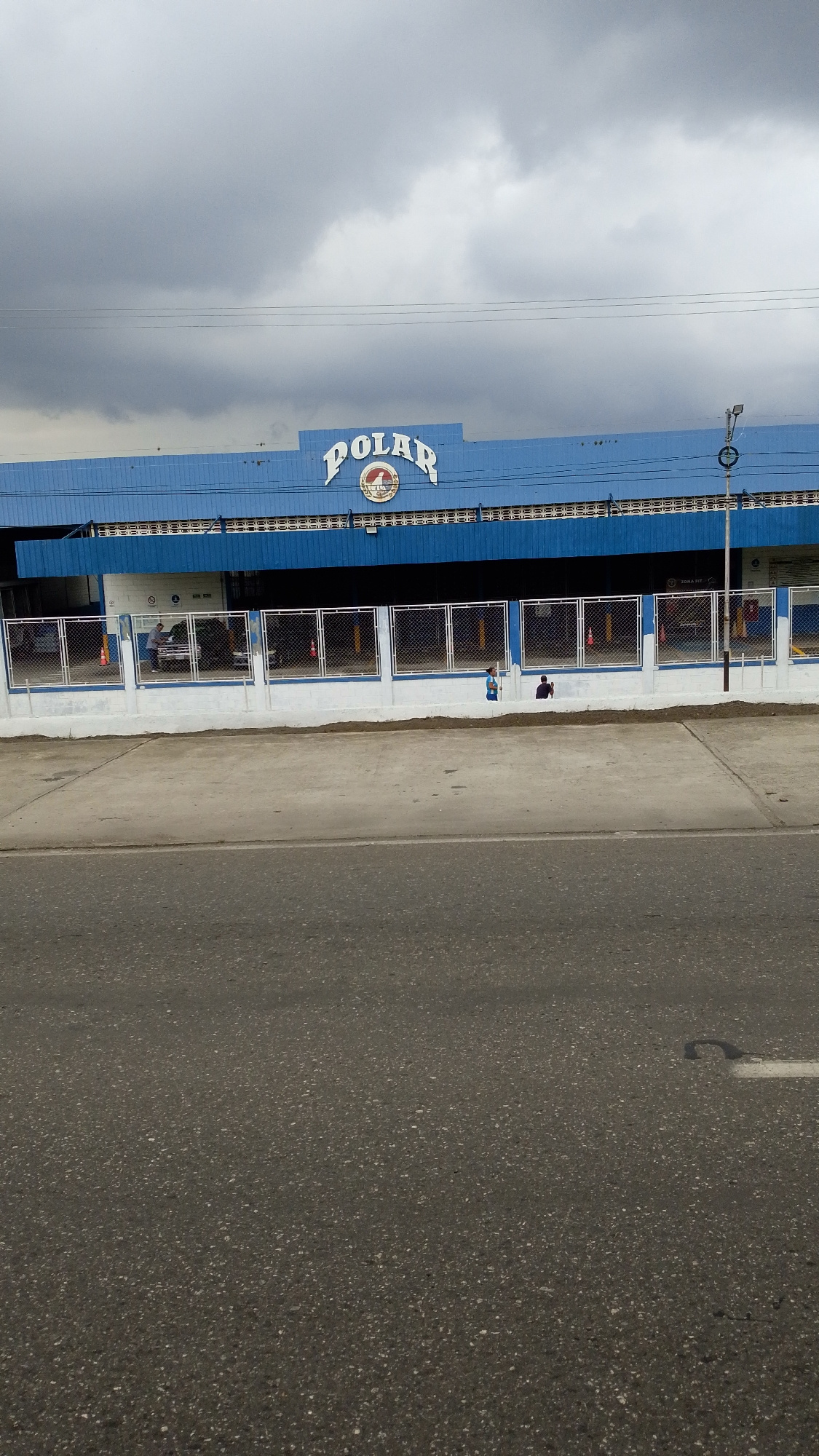 The image shows the exterior of the Polar Brewery in Tinaquillo, Venezuela. The building is a light blue, and the word "POLAR" is prominently displayed on the top. The front of the building has a whit…read more