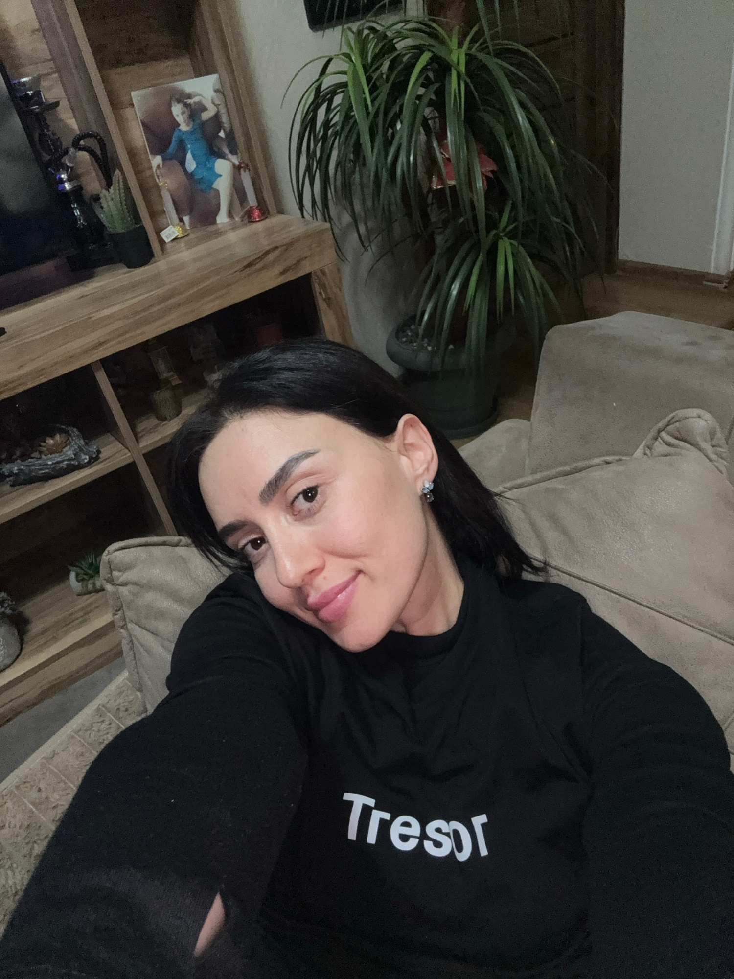 A woman with dark hair is reclining on a beige couch in what appears to be a residential setting. She is wearing a black long-sleeved shirt with the word "Tresor" printed on it in white. To her left i…read more