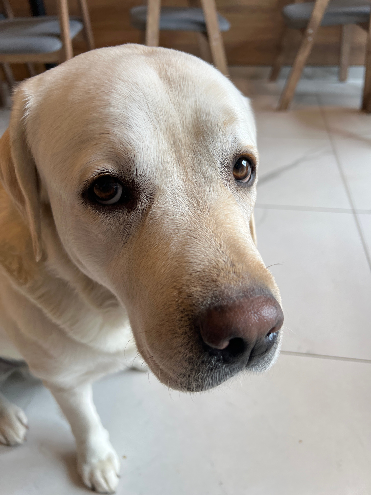 A close-up, upward-angled shot captures the head and upper body of a light-colored Labrador Retriever, likely indoors in Mytishchi, Russia. The dog, with creamy white fur, gazes attentively upwards an…read more