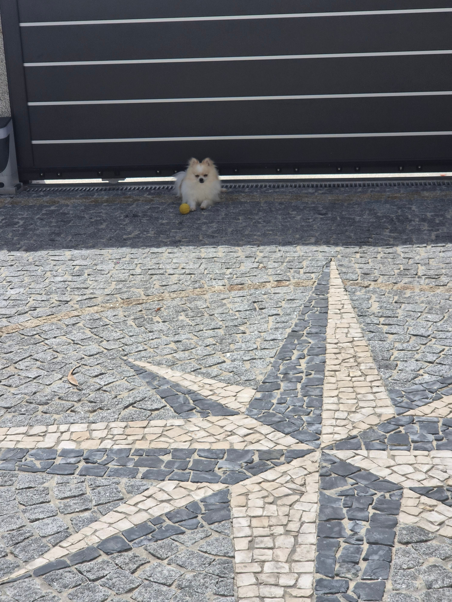 A photograph shows a small, fluffy white dog with a yellow ball in its mouth, positioned between a dark gray metal gate or door and a light gray cobblestone surface. The cobblestone surface features a…read more