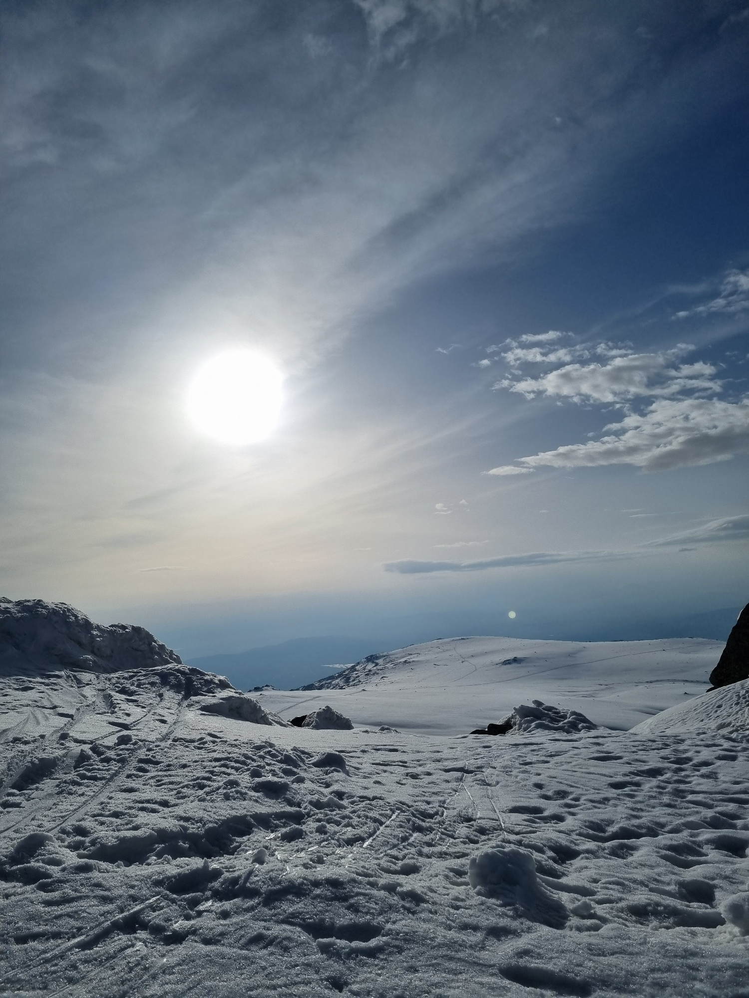 The image captures a bright, sunlit scene. The sky is a mix of blue and white, with streaky clouds dominating the upper portion. The sun is a prominent, bright white circle near the bottom. The foregr…read more