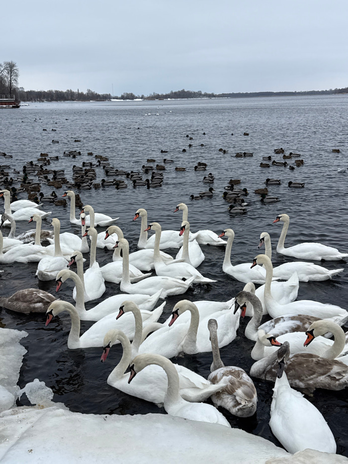 A wide shot depicts a winter scene on the Dnipro River in Kyiv, Ukraine, under an overcast sky. The foreground features dark, rippled water with numerous white Mute Swans clustered densely, some appea…read more