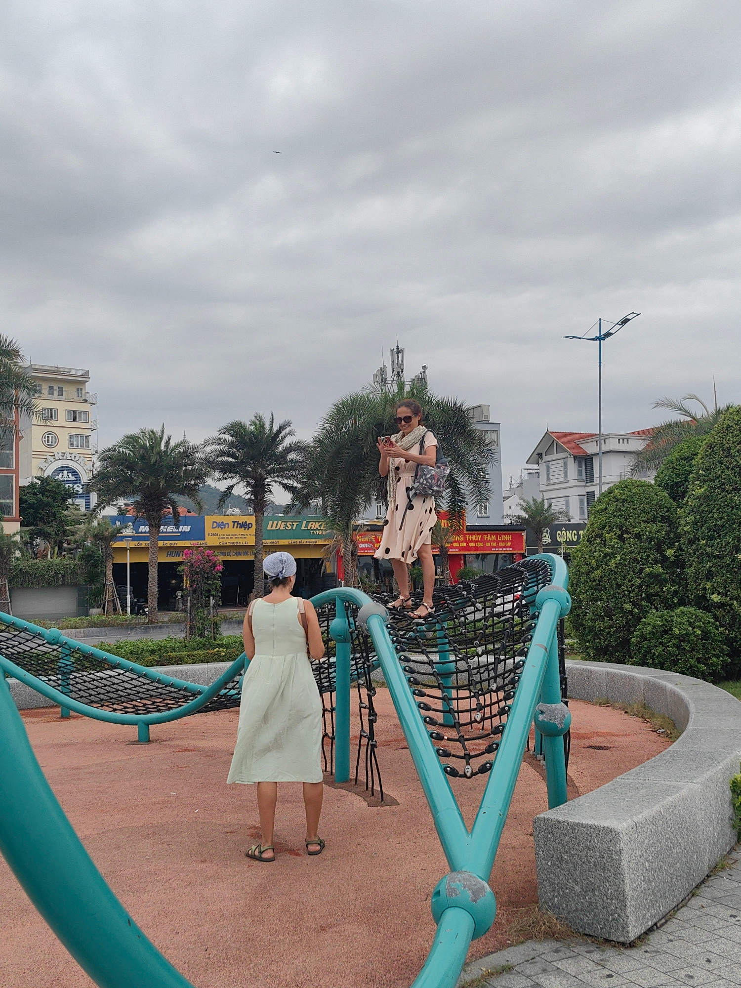 The image, taken in Ha Long Ward, Vietnam, shows two women interacting on a playground. One woman, wearing a light green dress and a blue headscarf, stands on the ground, facing away from the camera.…read more