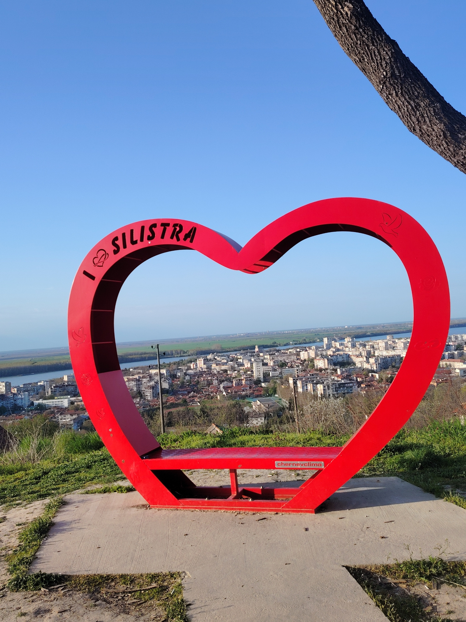 A view of the city of Silistra is seen through a large red heart-shaped frame. The frame has the words "I ❤️ SILISTRA" at the top. The structure also serves as a bench seat. A body of water and green…read more