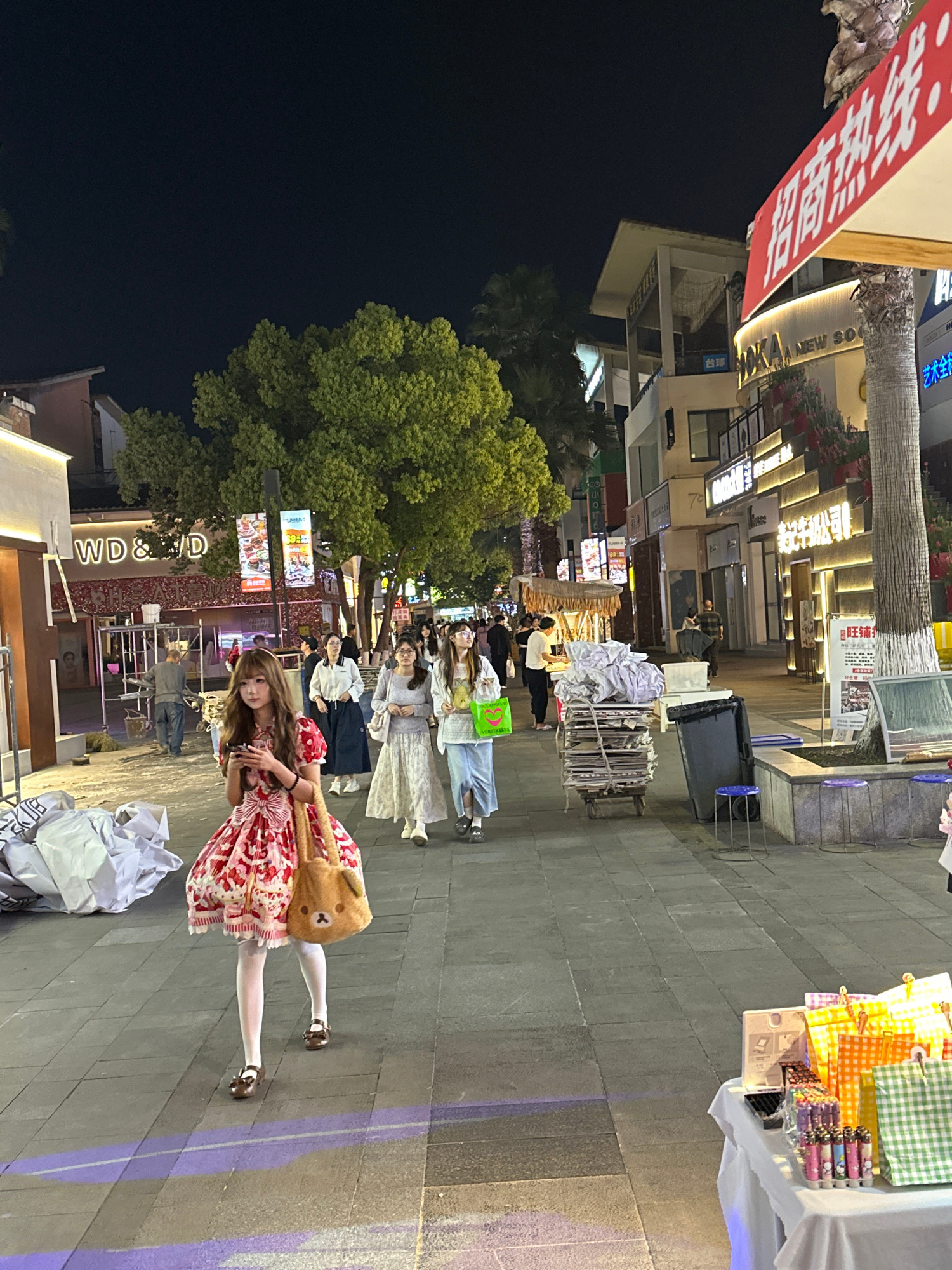 The image shows a group of people on a street in what appears to be a commercial area. The street has several shops and businesses, as indicated by the signs and storefronts. At the front of the groupβ¦read more