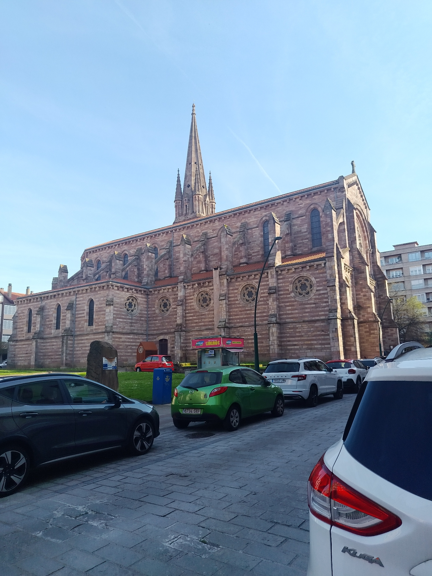 The image depicts a street scene in Torrelavega, Spain, dominated by the exterior of a large, brown-stone church with a tall, pointed steeple. The church occupies a significant portion of the frame. P…read more