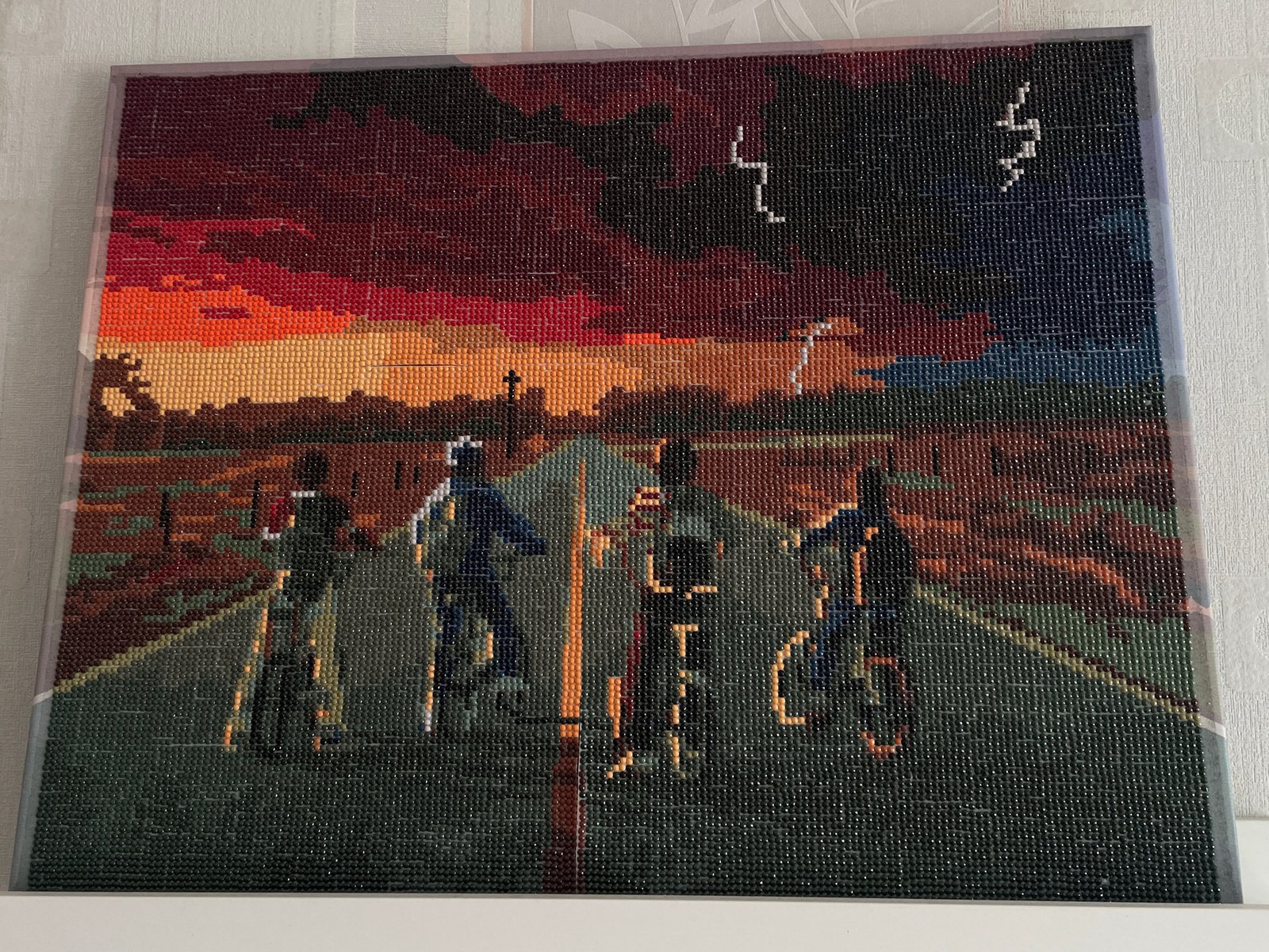 A framed diamond art rendering depicts four children on bicycles on a road, silhouetted against a dramatic sunset and storm. The background features a dark sky with flashes of lightning, contrasting w…read more