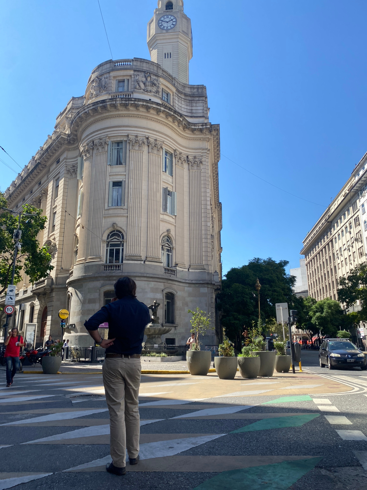 The image shows a street scene in Buenos Aires, Argentina, featuring a man standing on a crosswalk looking at the Palacio de la Legislatura de la Ciudad de Buenos Aires, a government building. The manβ¦read more