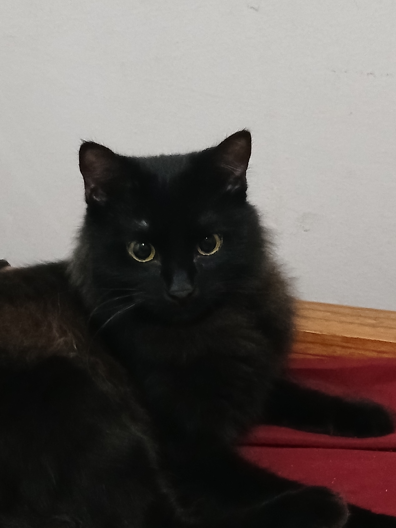 The image displays a close-up portrait of a fluffy black cat, photographed with a sideways orientation, making its head appear on the left side of the frame. The cat's head is slightly tilted, and its…read more