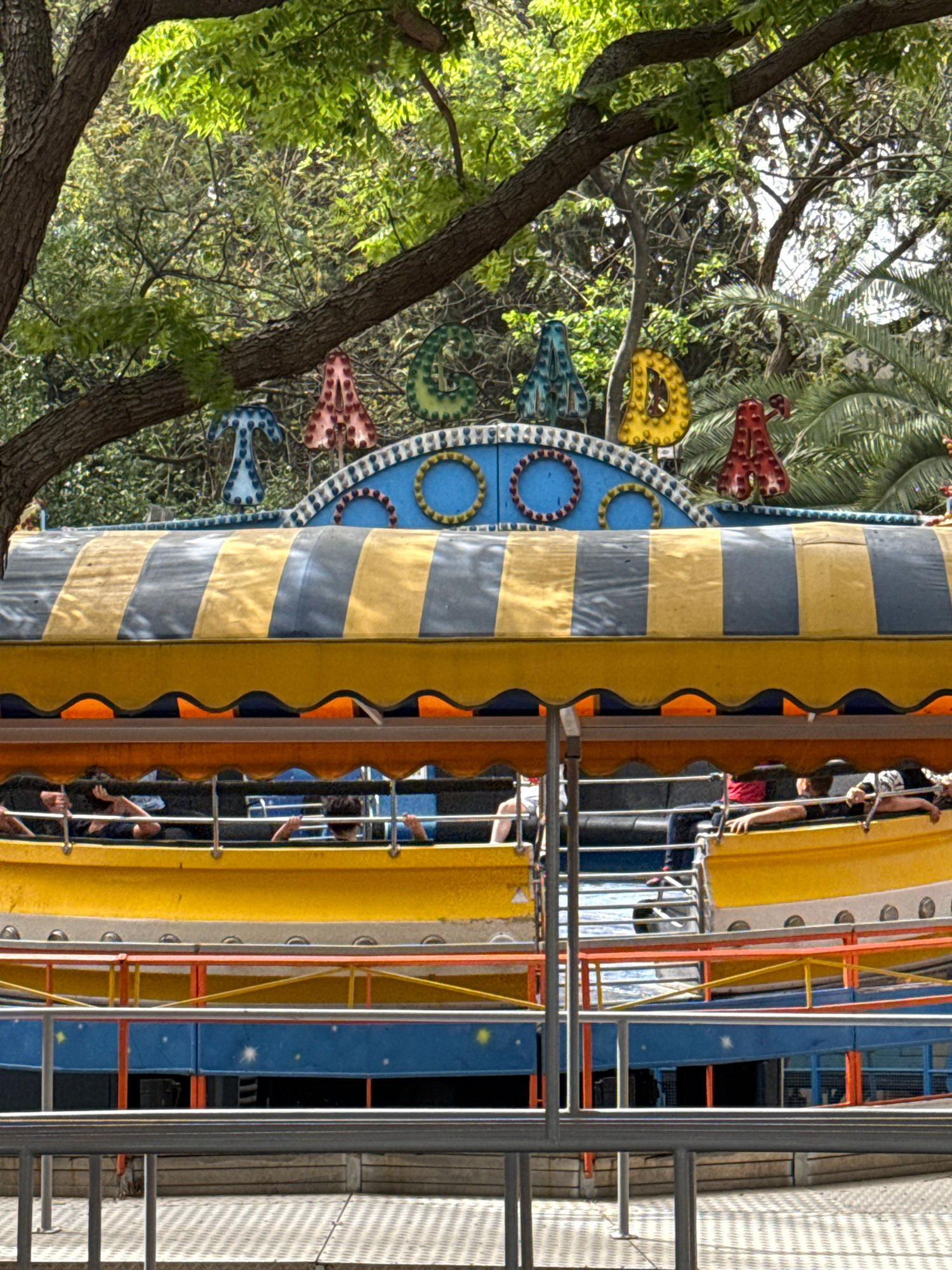 The image shows a carousel ride in Tel-Aviv, Israel. The ride is partially visible with blue and yellow striped decoration and cartoonish sea creature figures. People are seated in the ride's individu…read more