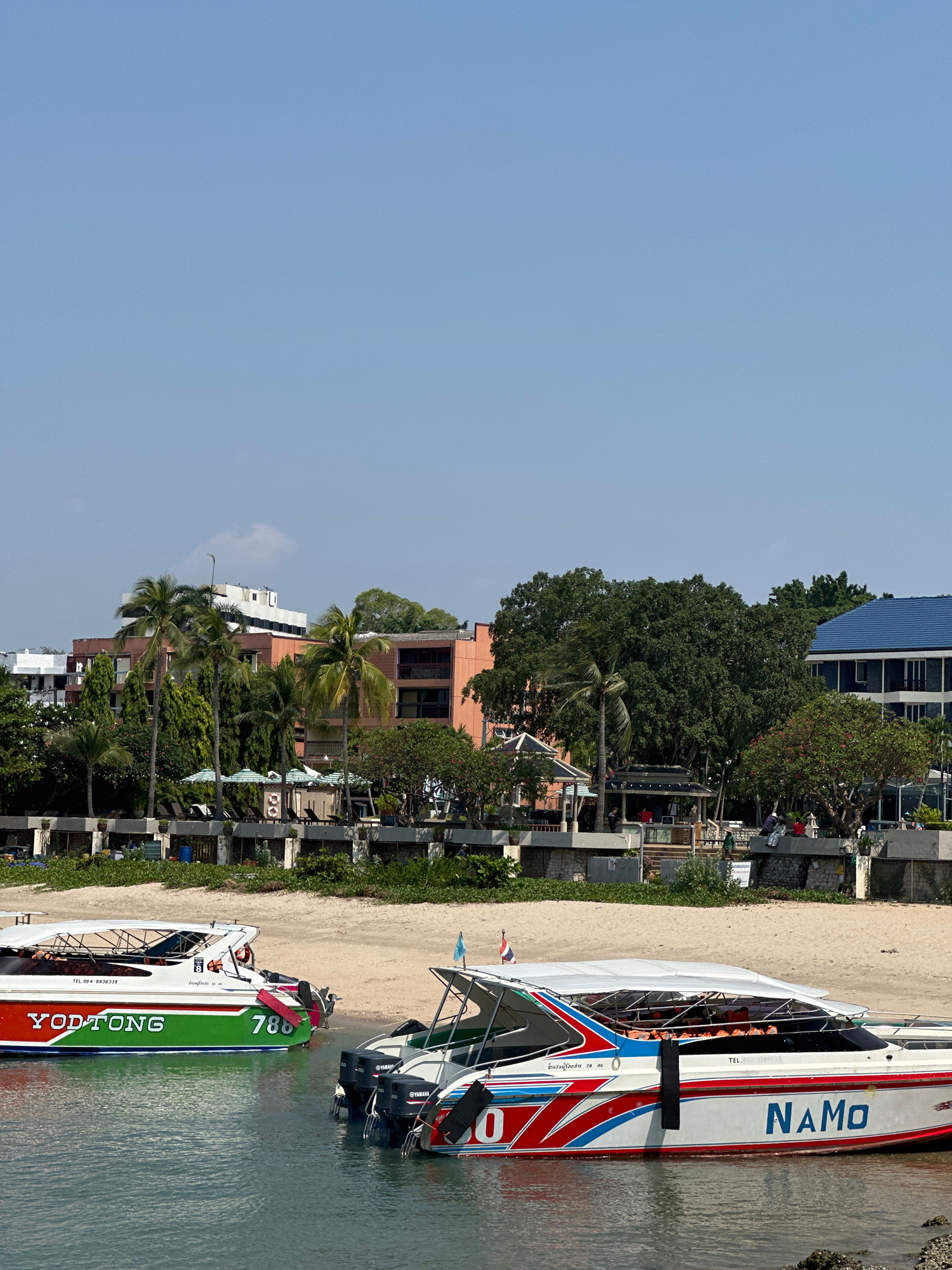 This image shows a view of a beach in Pattaya City, Thailand. The image is taken horizontally and then rotated 90 degrees counter-clockwise. The beach is lined with buildings and trees. There are two…read more