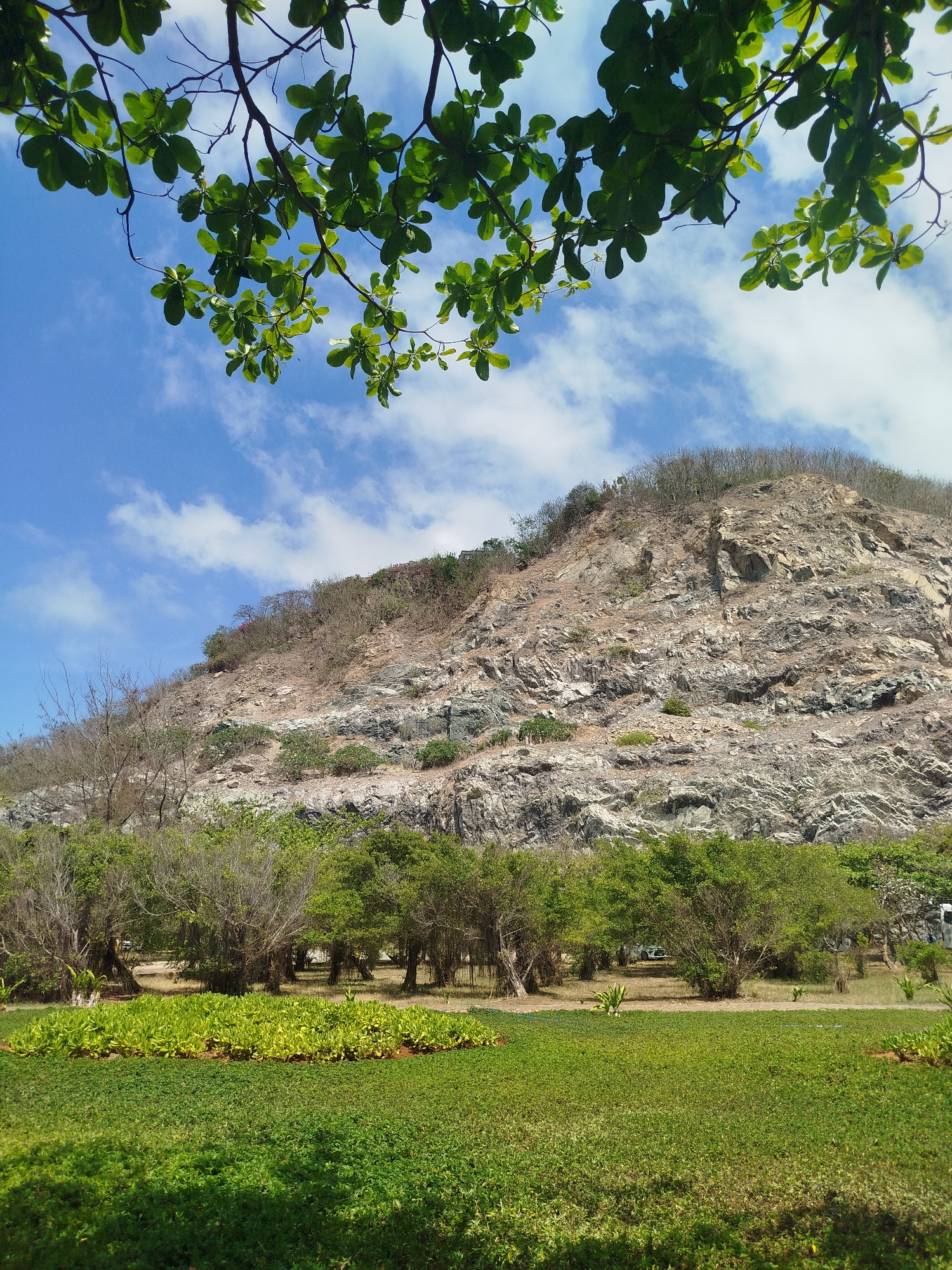 The image shows a landscape with a mountain as the backdrop. The mountain is rocky with layers of different colored stone and some sparse vegetation. At the foot of the mountain, there is a line of tr…read more