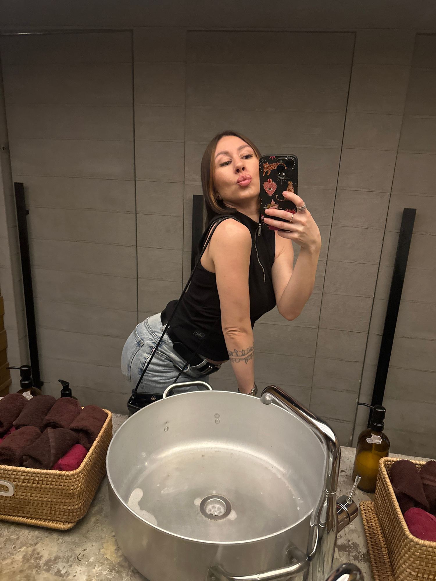 A woman is taking a selfie in a bathroom. She is wearing a black tank top and light blue jeans. The bathroom has a modern sink with a chrome faucet. There are baskets of towels on either side of the s…read more