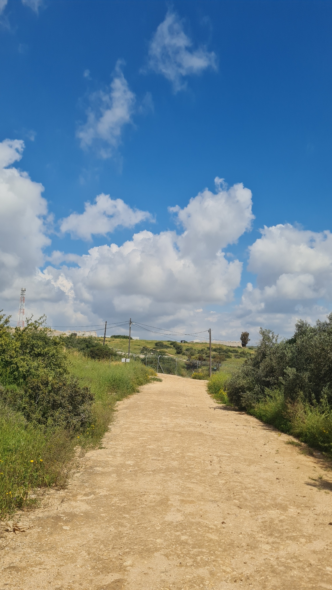 The scene is an outdoor setting in the Lachish Regional Council, Israel, featuring a dirt path extending into the distance. The path is bordered on one side by green vegetation and trees, and on the o…read more