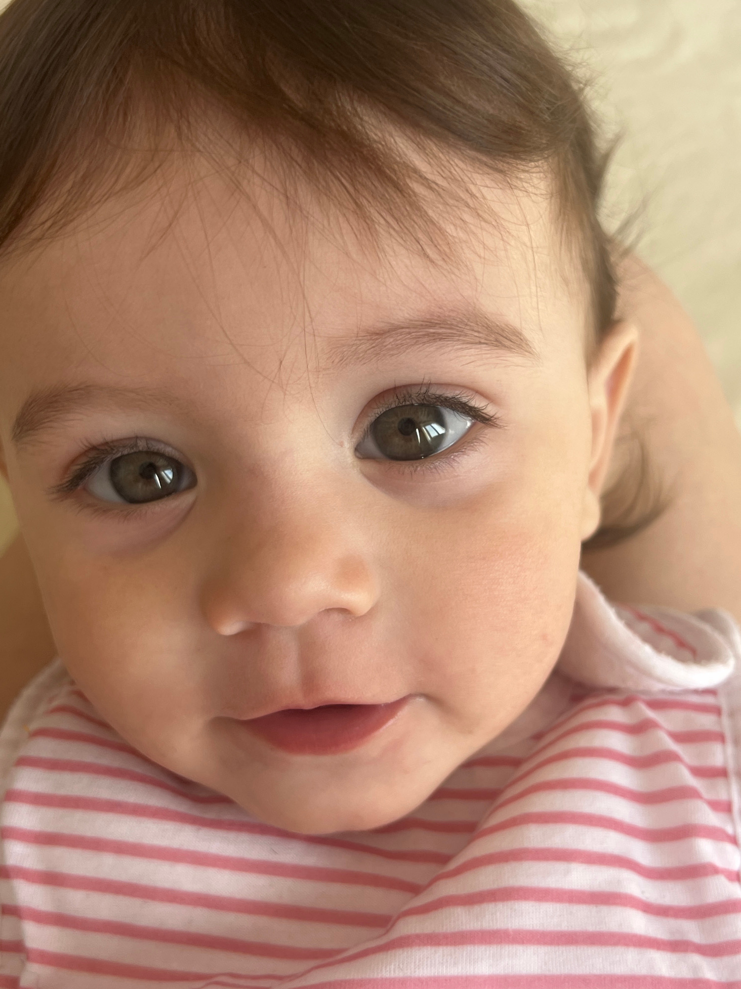 A close-up shot shows a baby lying on their back, angled towards the viewer. The baby has light skin, brown hair, and large, round, dark brown eyes that are looking directly at the camera. The baby is…read more