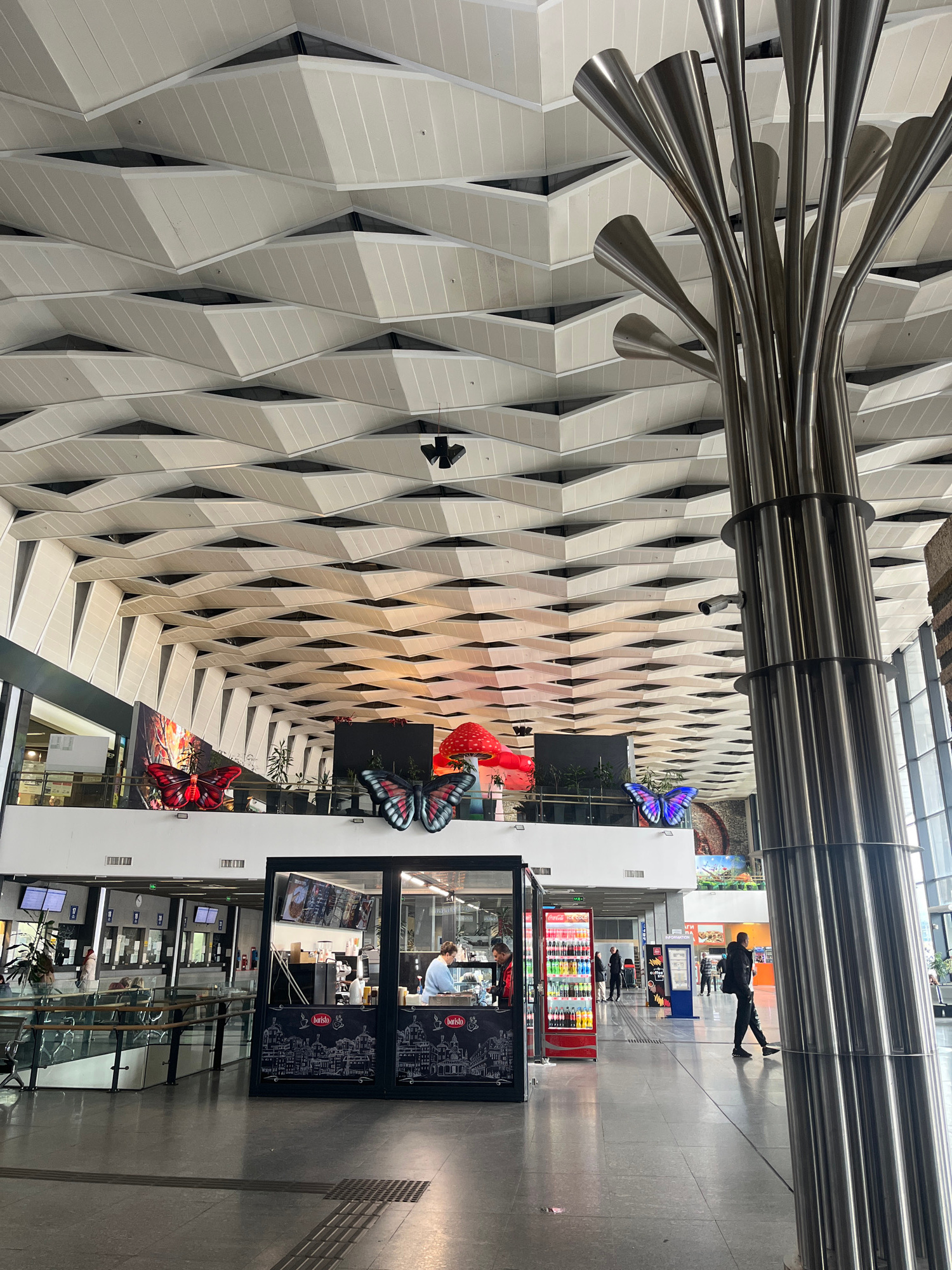 This indoor shot features a textured ceiling that is angled. At the upper-left is a series of what appears to be metal pipes. Running across the top is a metal support bar, and in the background, a pe…read more