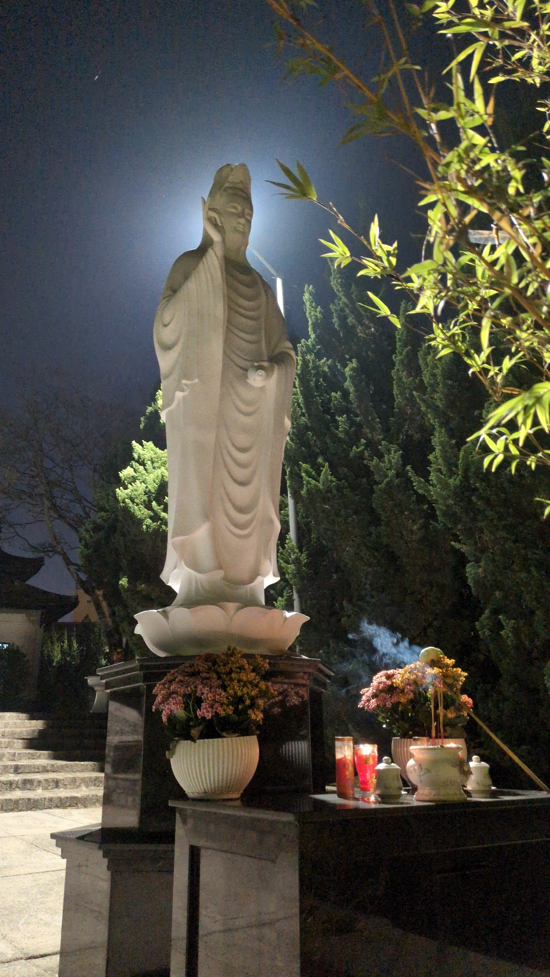 A horizontally oriented, low-angle photograph depicts a reclining Buddha statue at night in Da Lat, Vietnam. The statue, rendered in a pale material (possibly marble), is positioned on a plinth with a…read more