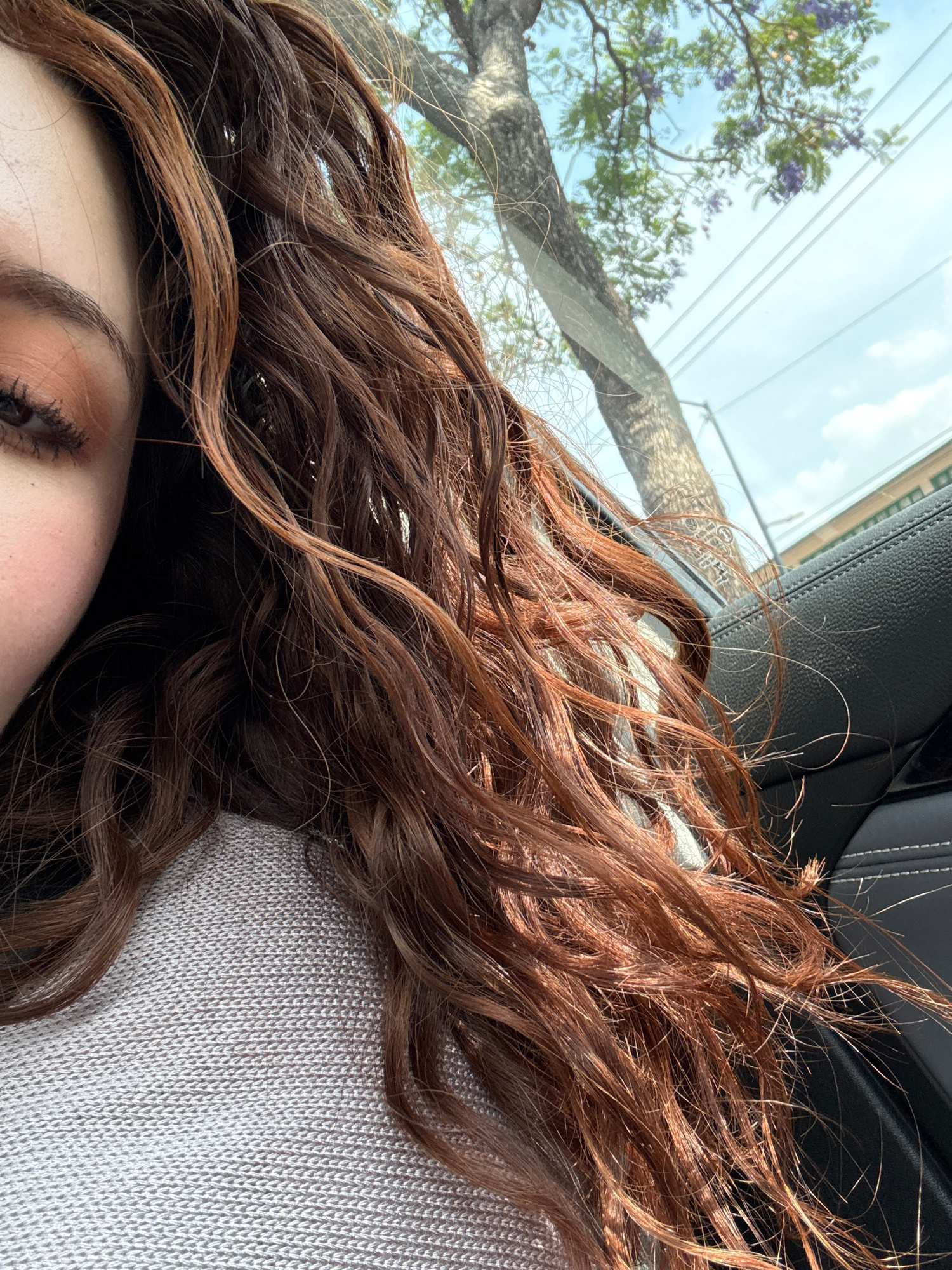 The image shows a partial view of a person lying down, likely in a car, with the person's brown hair spread across a gray knit surface. A visible eye with eyelashes is in the lower left. The backgroun…read more