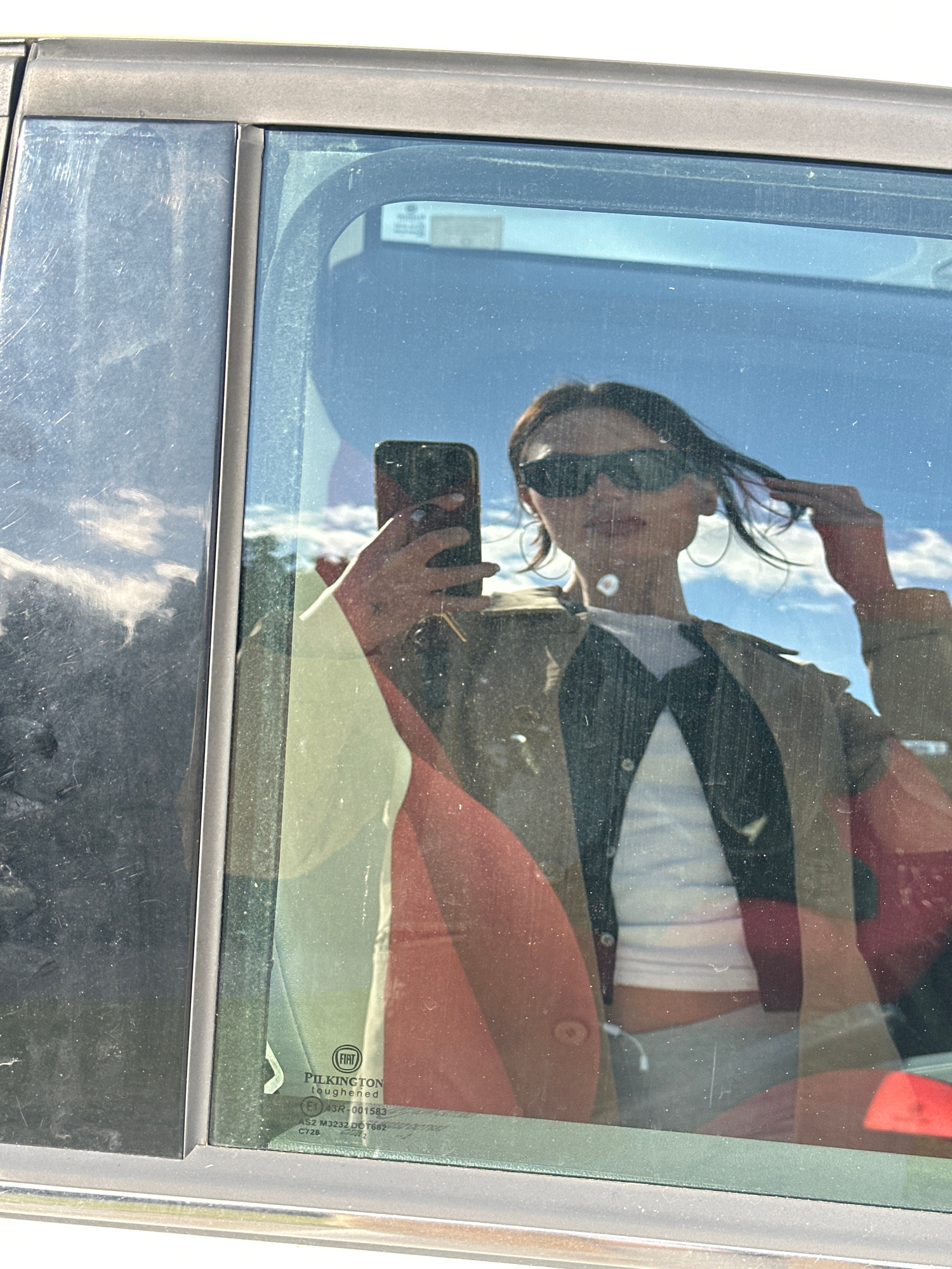 The image captures a reflection of an individual taking a selfie in a car window, situated in the city of Wealden, United Kingdom. The reflected subject, appearing to be a female with dark hair, is we…read more