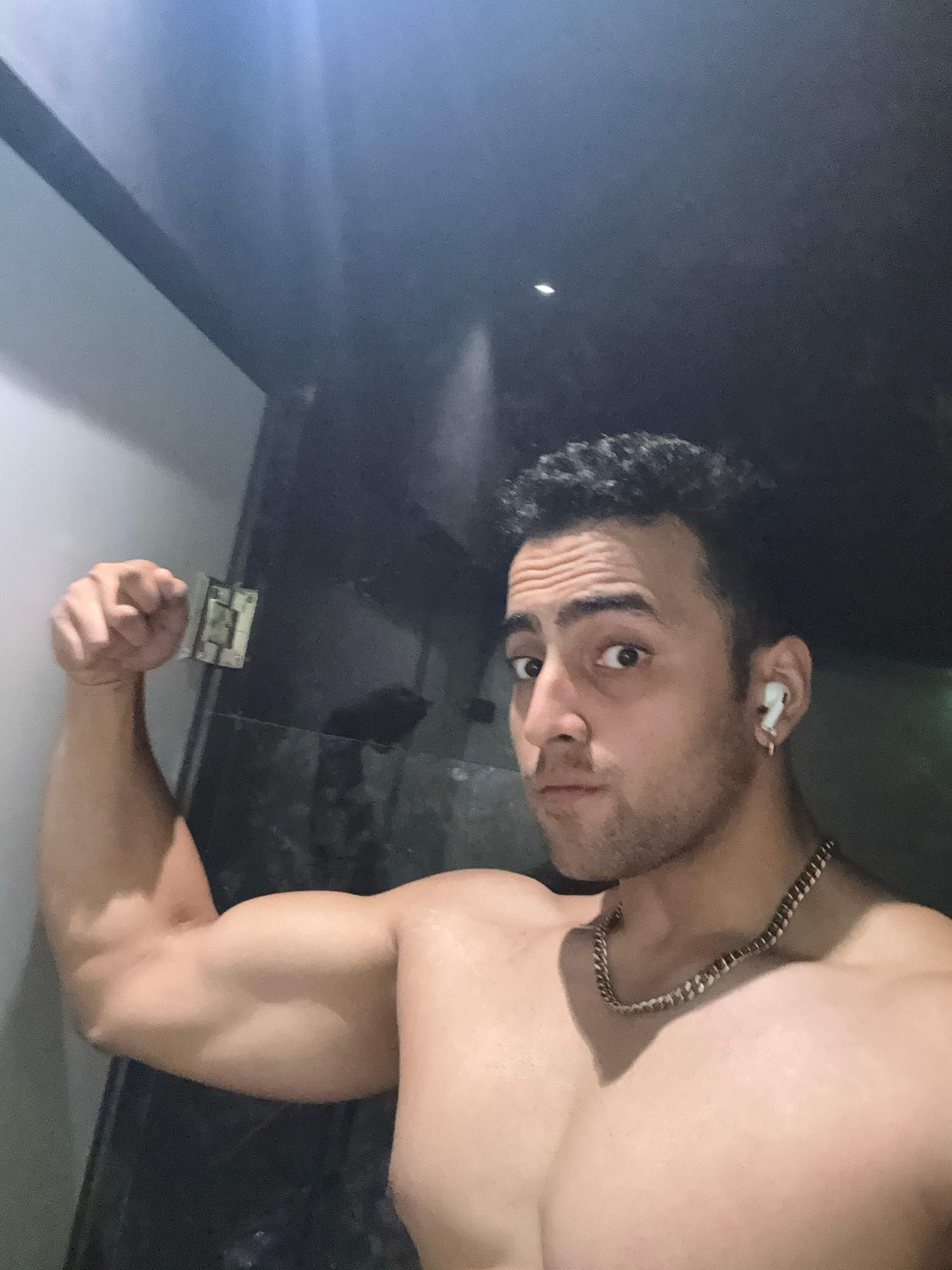 A shirtless male individual is depicted indoors, flexing his left bicep. He faces the camera directly, with a serious expression, wide eyes, and furrowed brows. He has dark, curly hair and stubble onβ¦read more