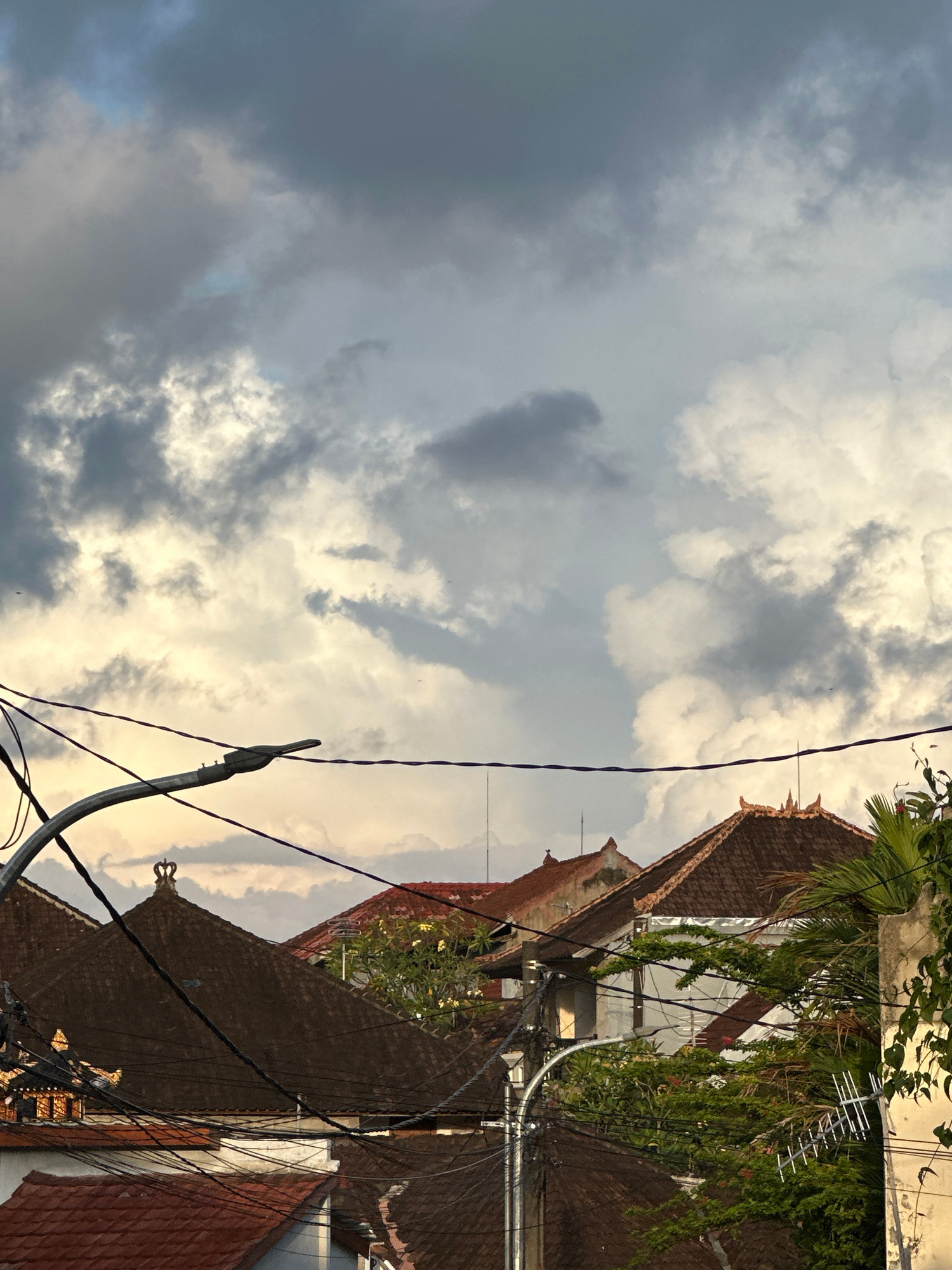 The image depicts a street scene in North Kuta, Indonesia. The sky is filled with cumulus clouds, transitioning from dark gray on the left to lighter, sunlit patches on the right. Below the sky, tradi…read more